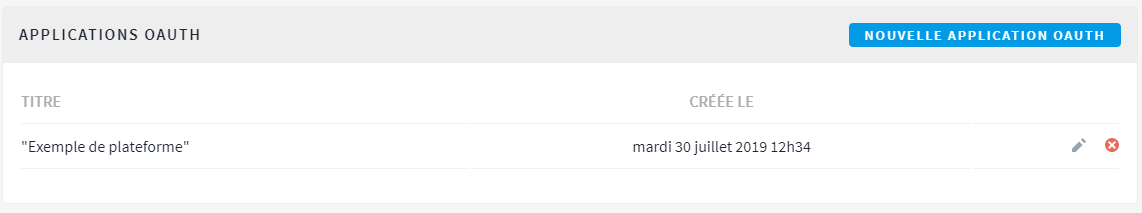 Cliquez sur "Sauvegarder". De retour sur la page de gestion des applications oAuth, vous pouvez éditer votre application en cliquant sur l'icône "Modifier" ou la supprimer en cliquant sur l'icône "Supprimer".