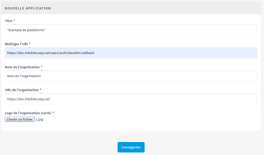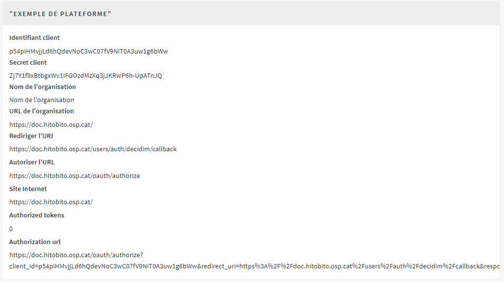 - Le titre de l'application oAuth : le nom de la plateforme qui demande les données de connexion à la plateforme Decidim