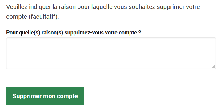 4 - Rentrez une raison pour laquelle vous effectuez cette démarche (facultatif) puis cliquez sur "Supprimer mon compte" :