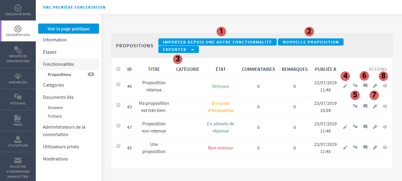 - Visualiser : permet de visualiser la page de la proposition sur l'espace utilisateur.