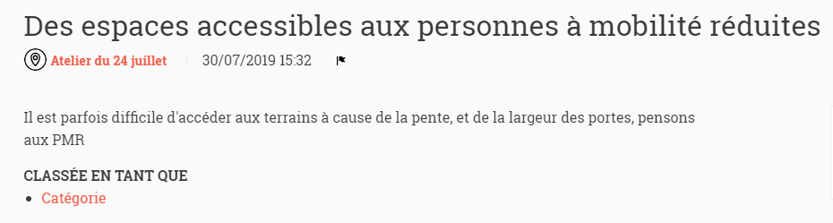 Vous pouvez également lier une proposition à une réunion du même espace participatif en cochant "Cette proposition provient d'une réunion" et en sélectionnant la réunion concernée. Cela permet de créer un lien entre la participation présentielle et en ligne. Sur la proposition concernée, il sera donc indiqué aux utilisateurs que cette proposition est issue d'une rencontre (ci-dessous : de l'atelier du 24 juillet).