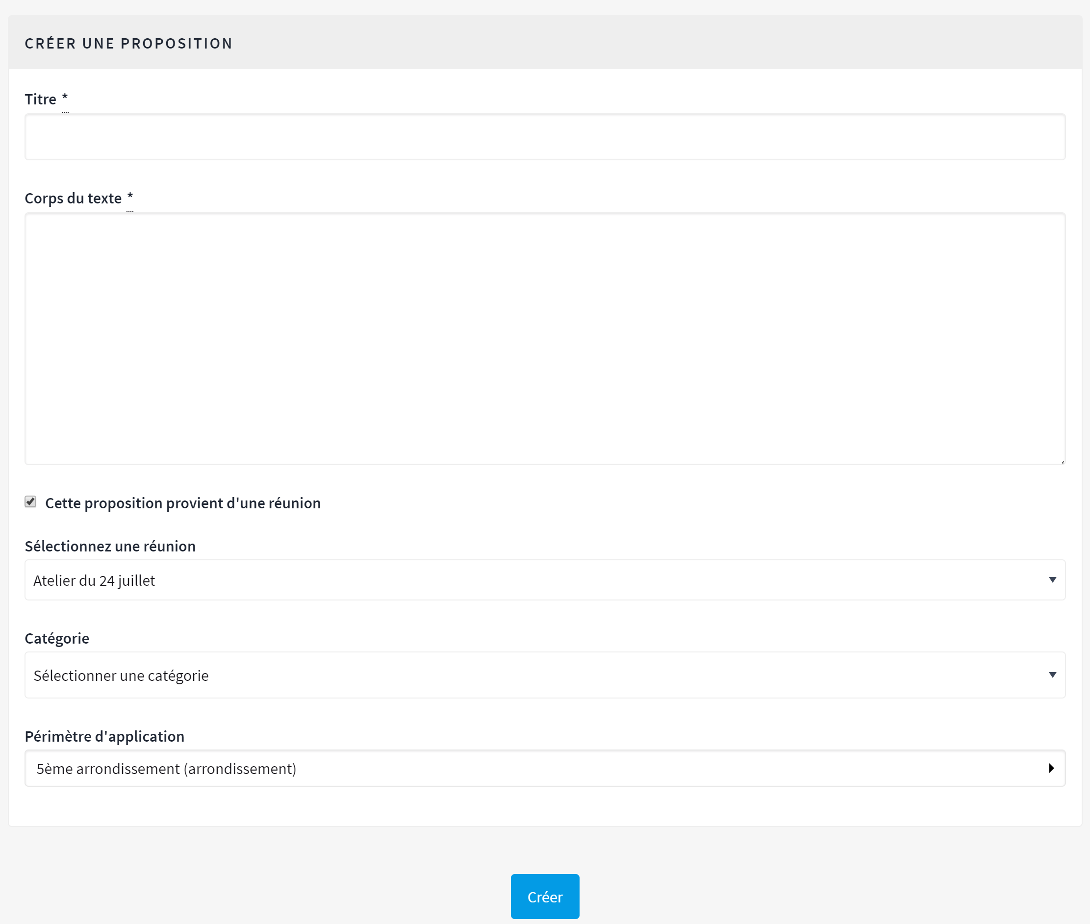 Pour créer une proposition officielle, cliquez sur " Nouvelle proposition". La fenêtre qui s'ouvre vous permet d'éditer une nouvelle proposition. Vous devez remplir le Titre de votre proposition officielle, sa Description, son Adresse (si l'option géocodage est activée) et ajouter une pièce-jointe. Puis, cliquez sur "Créer".