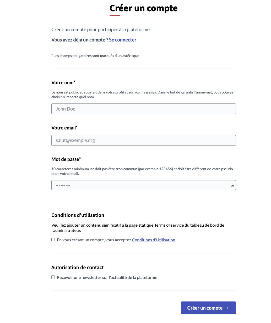 Puis, il vous faudra accepter les conditions d’utilisation de la plateforme et si vous le souhaitez (nous vous le conseillons) cocher la case pour recevoir la newsletter. Cette newsletter vous informera des actualités principales des processus de décisions, des nouveaux moments de rencontres, de la date de commencement des prochaines étapes… En d’autres termes, elle est une bonne source d’information pour tout·e participant·e.