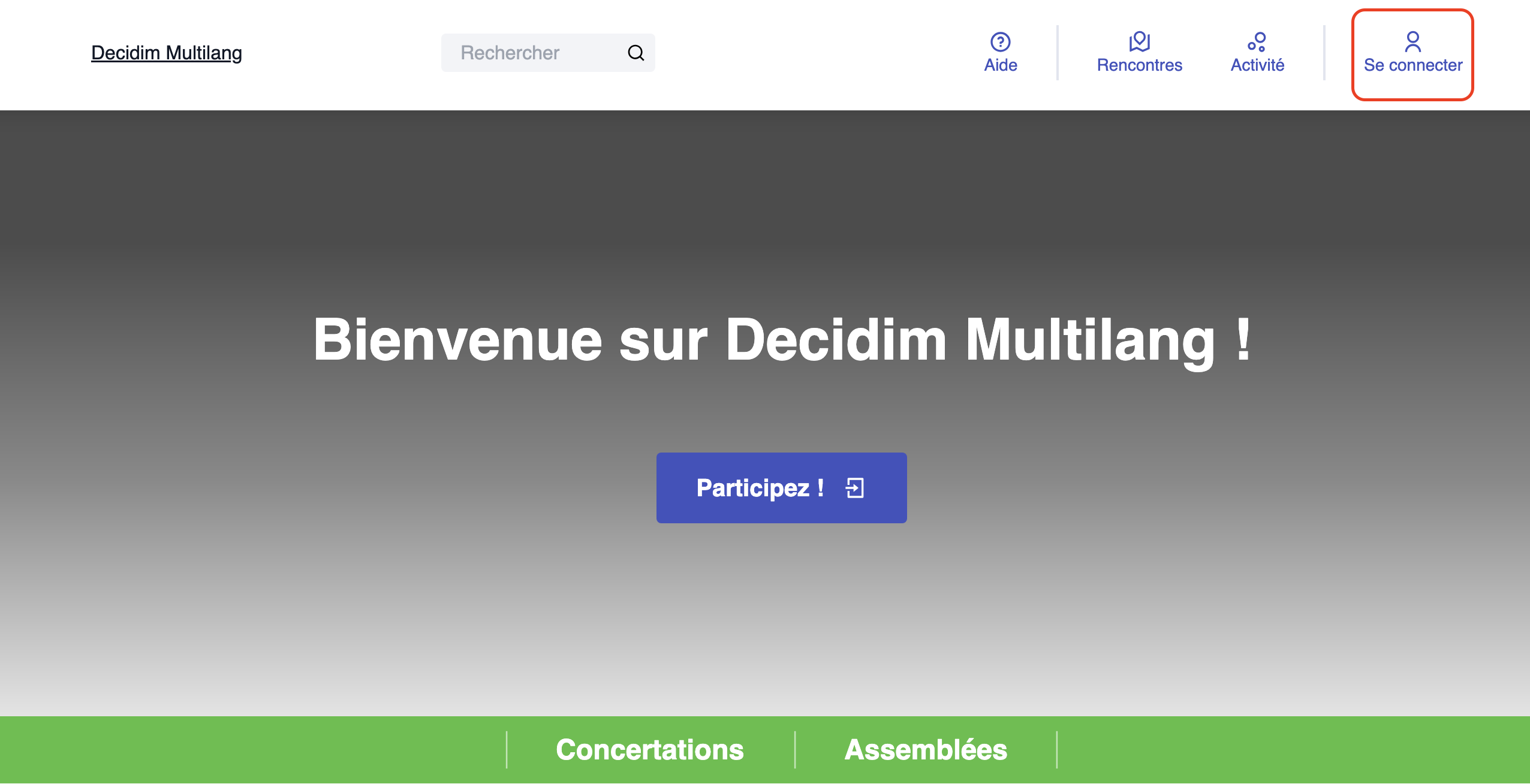 Avoir un compte sur la plateforme vous permettra d'accéder à l'ensemble des possibilités de participation. Pour vous inscrire, cliquez sur le bouton correspondant, en haut à droite de la page d'accueil (voir ci-dessous).