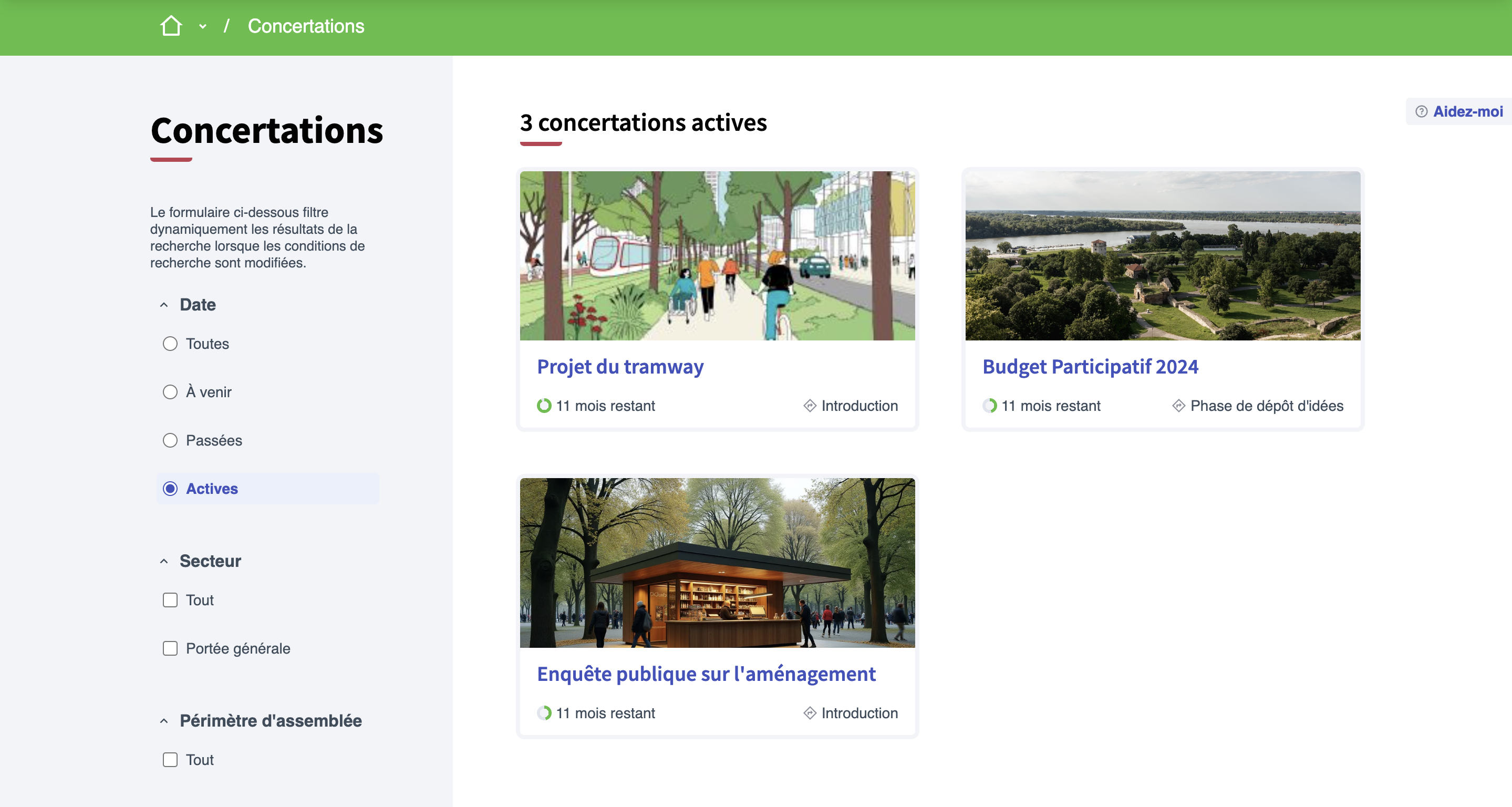 Les Concertations sont adaptées à la mise en place d’un dispositif participatif borné dans le temps, avec des étapes (budget participatif, consultation classique avec récolte/vote de proposition par exemple, etc.). Pour en savoir plus sur les concertations, cliquez sur ce lien.