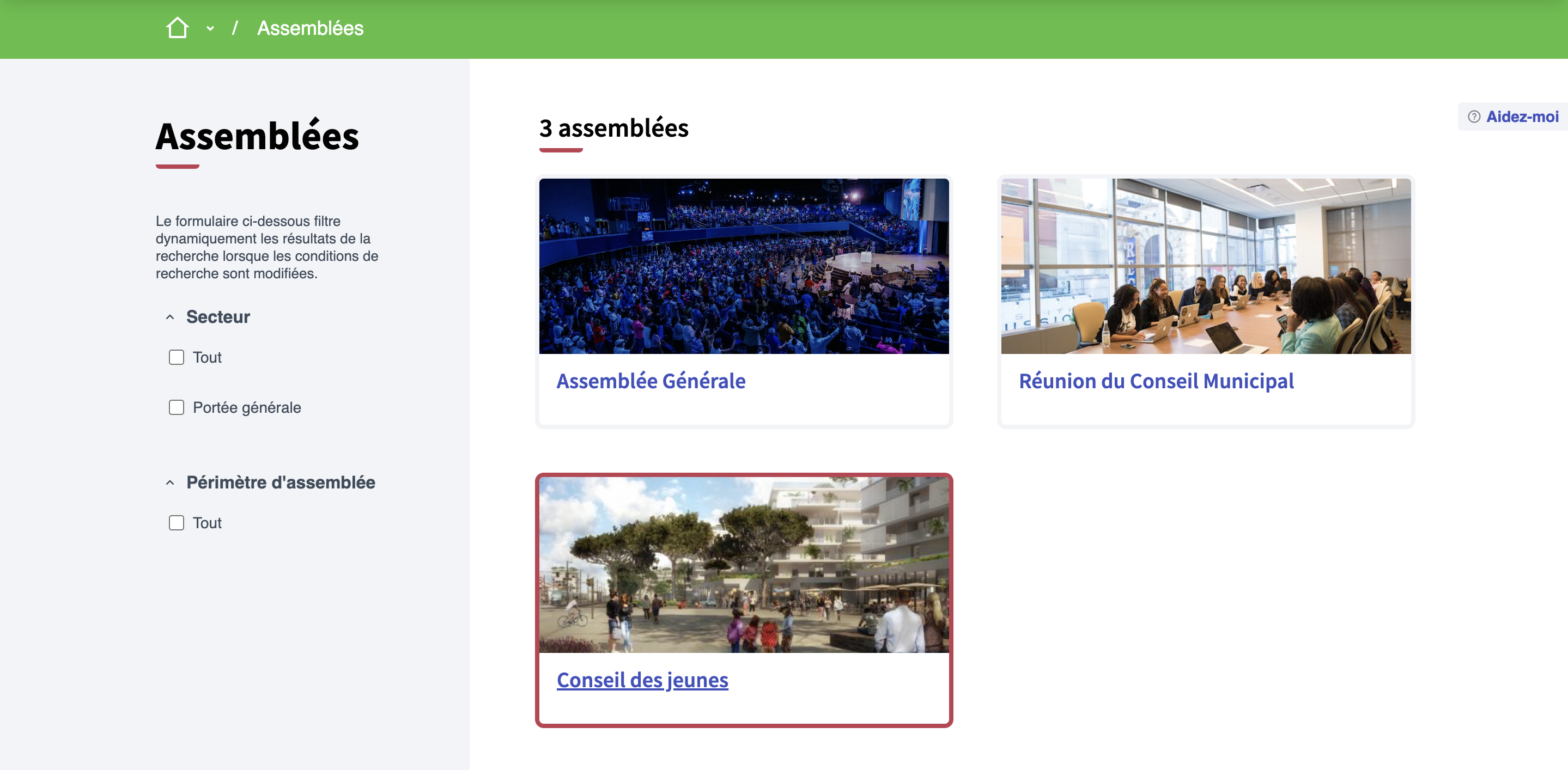 Les assemblées peuvent par exemple être utiles pour mettre en place un dispositif participatif interne à une organisation, lui permettant de créer des groupes de travail/sous-groupes via les sous-assemblées. Pour en savoir plus sur les assemblées, cliquez sur ce lien.