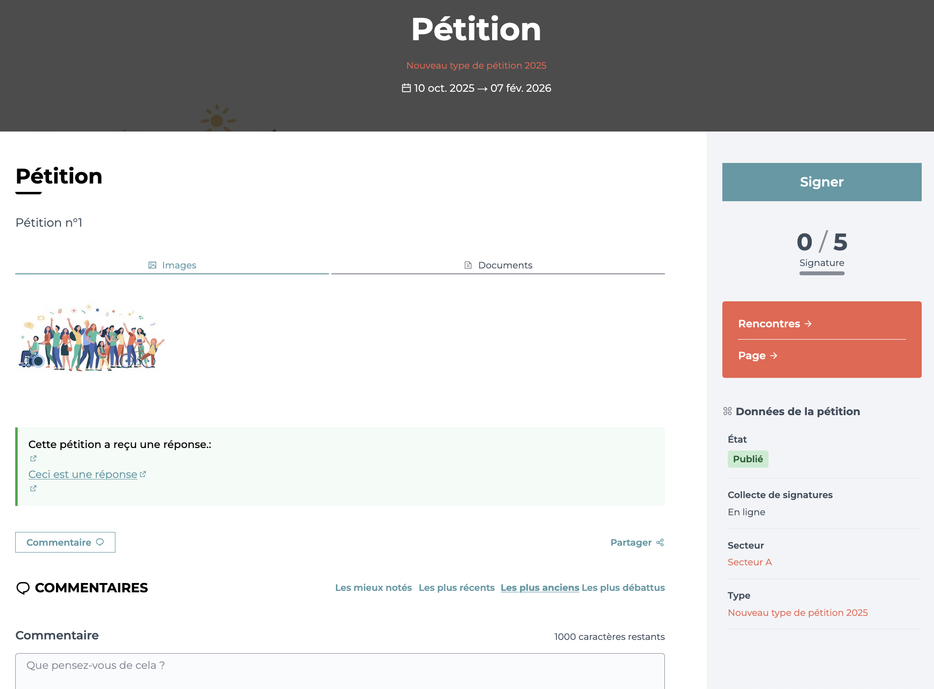 Les pétitions permettent aux utilisateur·ices de créer une pétition qui, après avoir été modérée a priori, pourra récolter des signatures pour une période donnée. Pour en savoir plus sur les pétitions, cliquez sur ce lien.