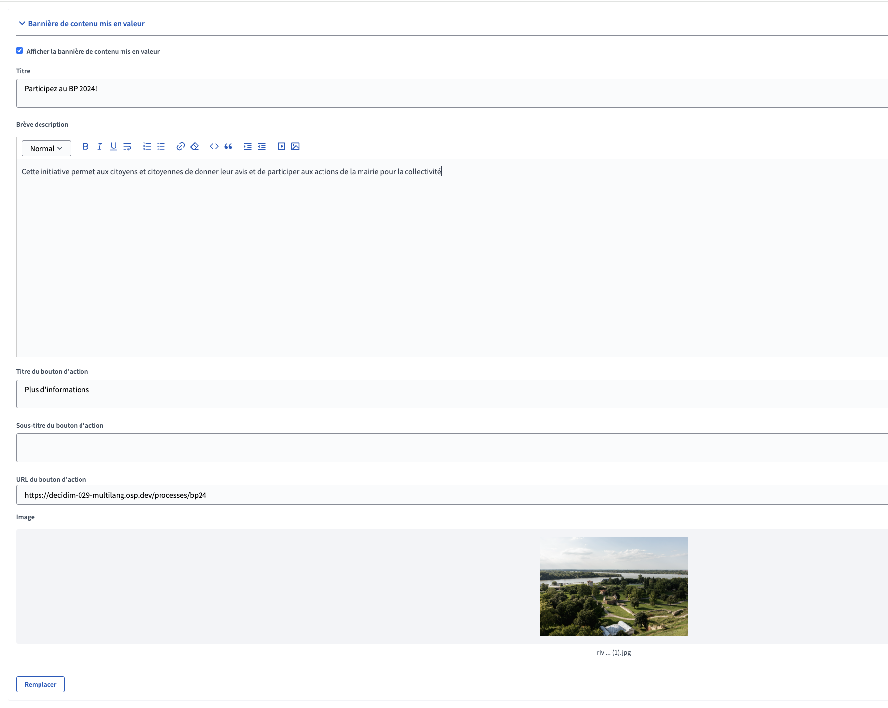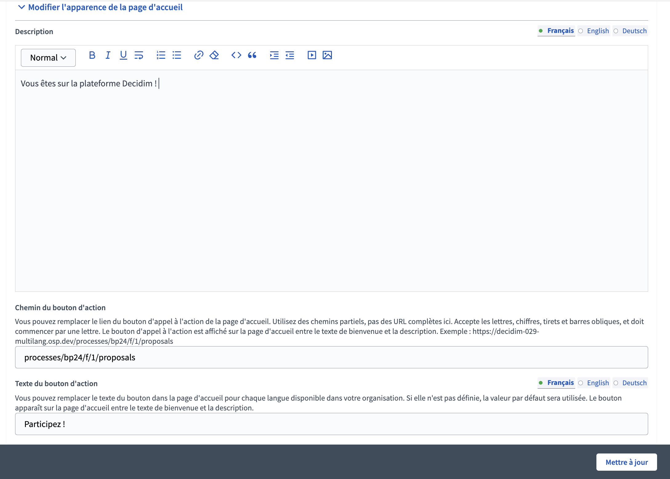 Ce champ permet de présenter une description générale de l'instance et de configurer un bouton d'appel à l'action, visible sur la page d'accueil, afin d'inciter les participant·es à rejoindre une concertation spécifique, comme le vote d'un budget participatif, par exemple.