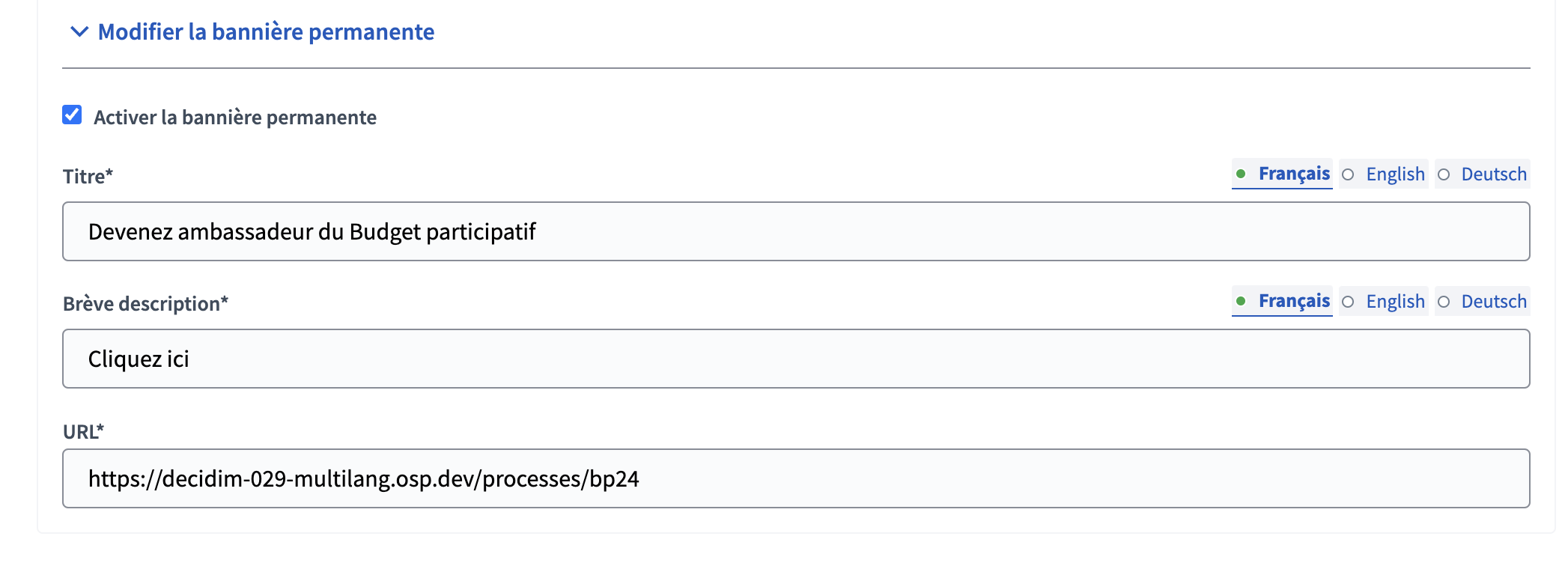 Ce champ permet d'activer une bannière en haut de votre instance, au dessus des entêtes, visible à tout moment depuis chaque page. Elle peut être utile pour afficher des informations très importantes que tous les Participant·e·s doivent voir, telles que la date d'un changement d'étape ou encore l'annonce des résultats d'une concertation.