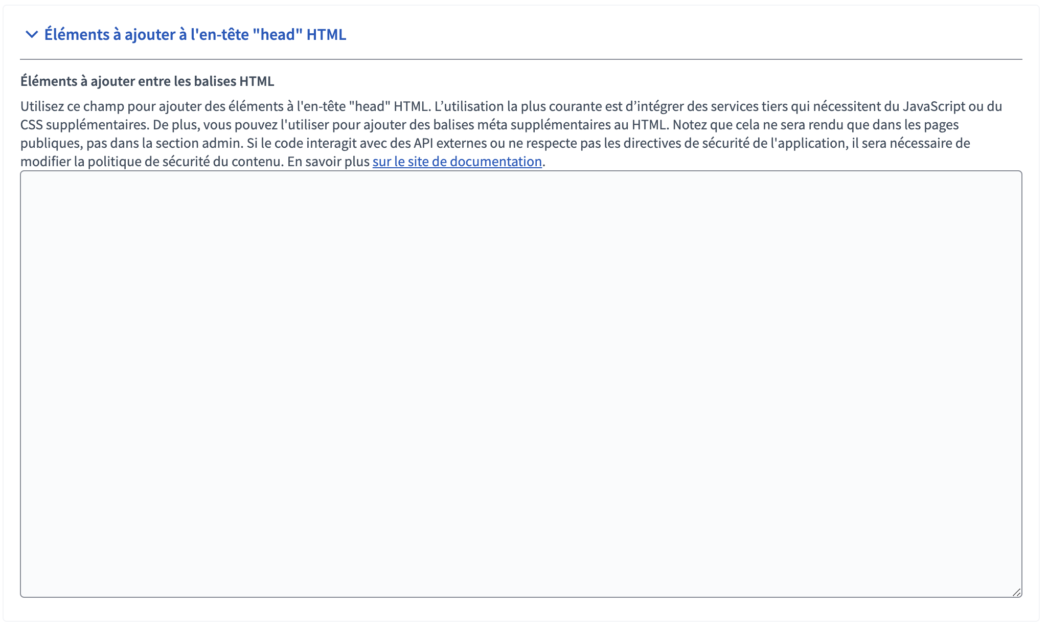 Ce champ permet d'ajouter du code à l'en-tête HTML. L'utilisation la plus courante consiste à intégrer des services tiers qui nécessitent du JavaScript ou du CSS supplémentaire. Notez que cela n'est effectif que dans les pages publiques, pas dans le Back-office.
