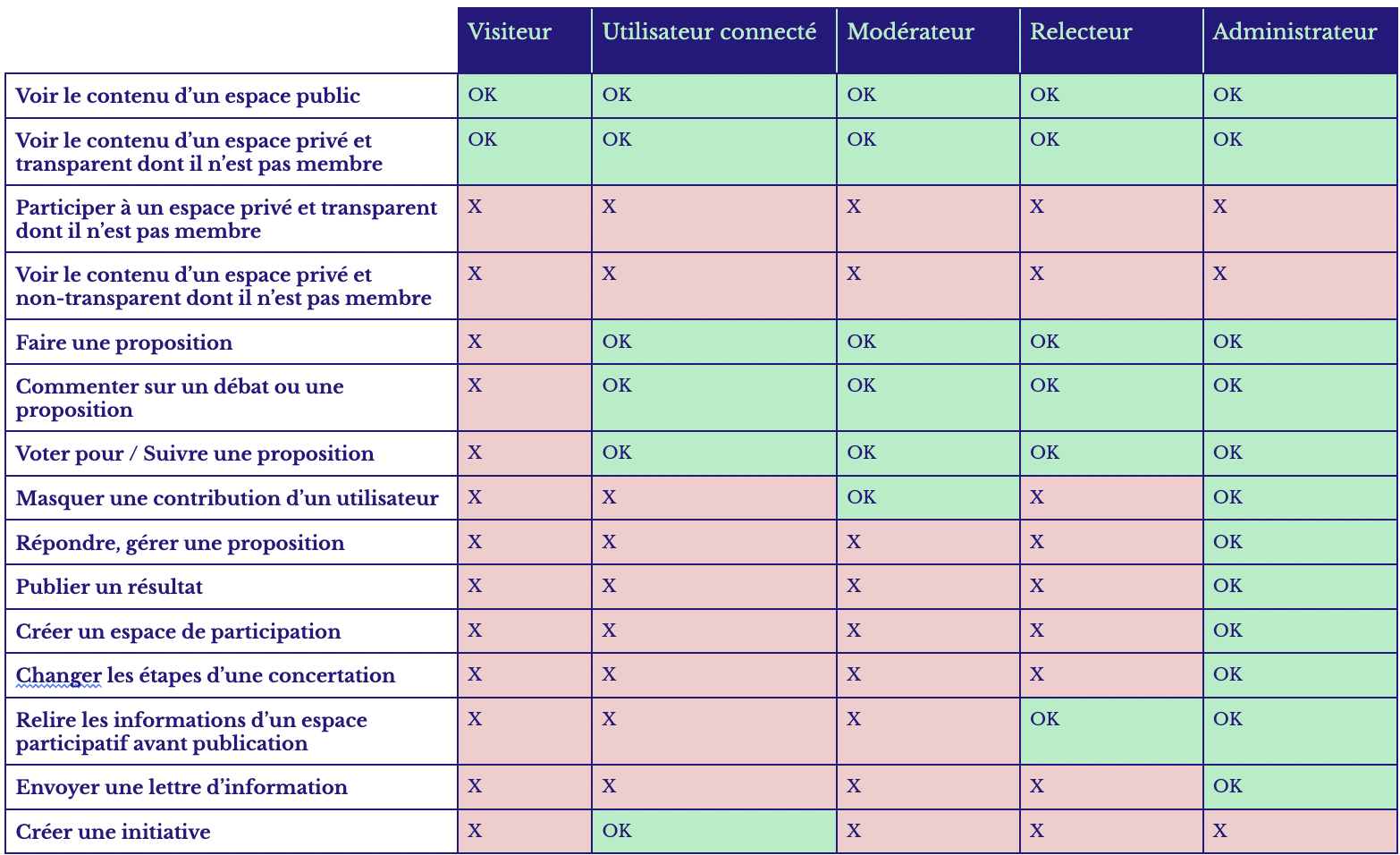 Sur les espaces de Decidim, il existe cinq types de rôles distincts : les visiteur·euses (visitent la plateforme mais n'ont pas créé de compte ou ne sont pas connecté·es), les utilisateur·ices connecté·es, les personnes en charge de la modération, celles de la relecture et celles de l'administration globale de la plateforme.