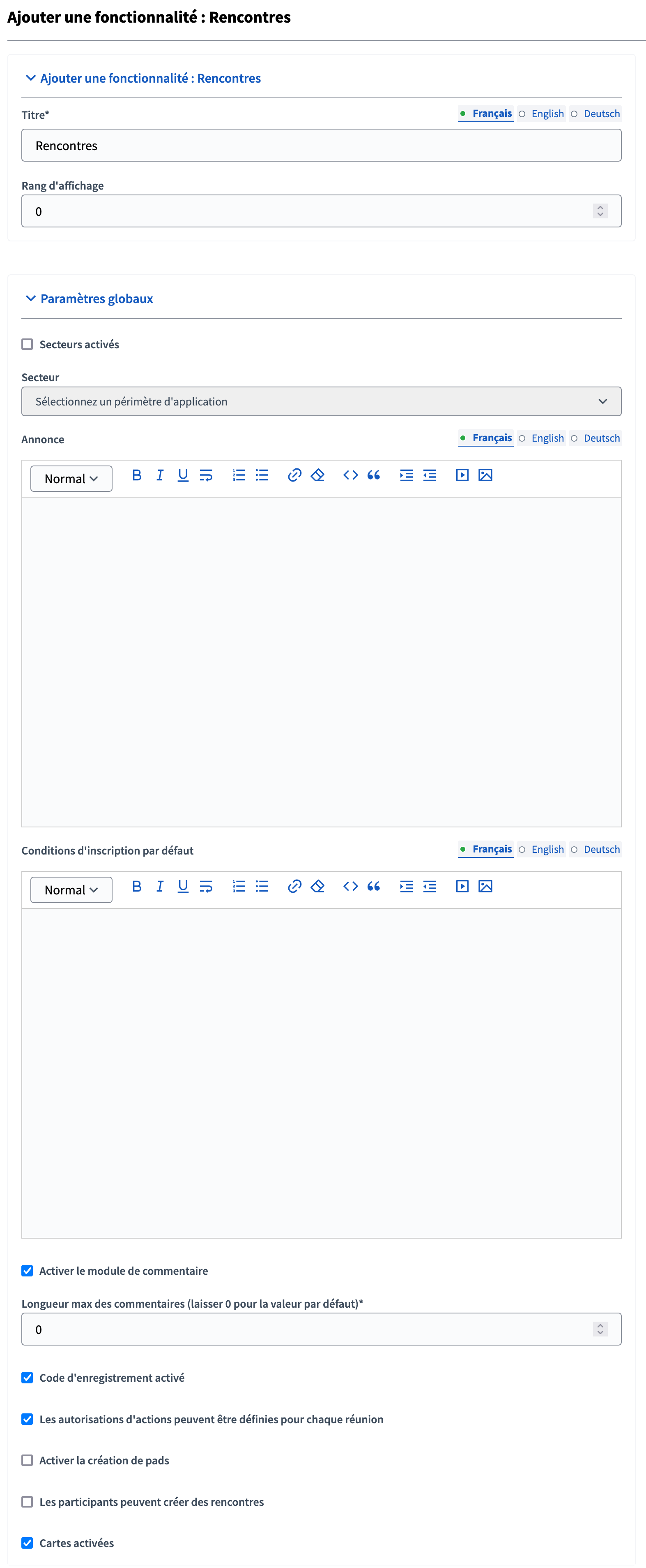 - cochez âActiver le module commentaireâ si vous souhaitez laisser les utilisateur·ices commenter les rencontres, et paramĂ©trez si vous le souhaitez une longueur maximum des commentaires,