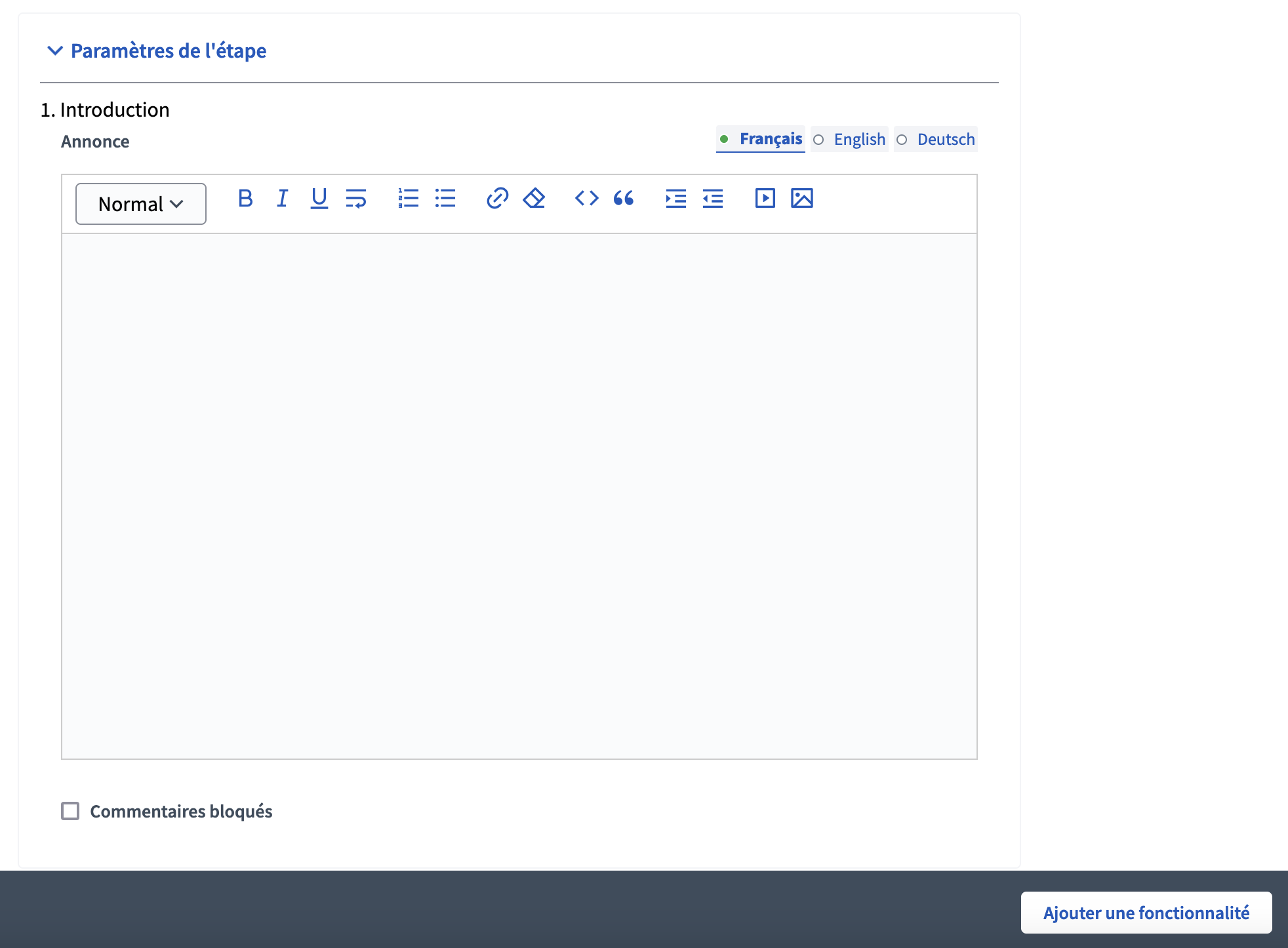 Ensuite, vous pouvez renseigner une annonce pour chaque Ă©tape, et si vous souhaitez empĂȘcher les utilisateur·rices de continuer Ă commenter les rencontres, cochez "Commentaires bloquĂ©s" (les commentaires laissĂ©s prĂ©cĂ©demment restent visibles).
