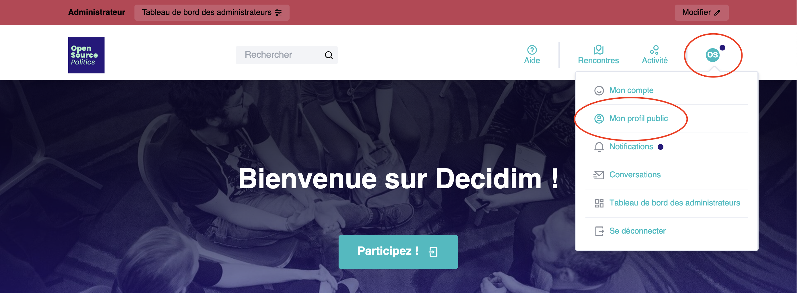 Pour créer un groupe d'utilisateurs, rendez-vous sur votre profil à l'aide du menu déroulant en cliquant sur "Mon profil public".