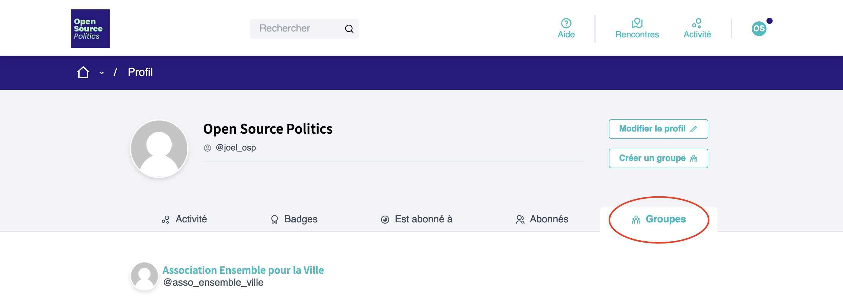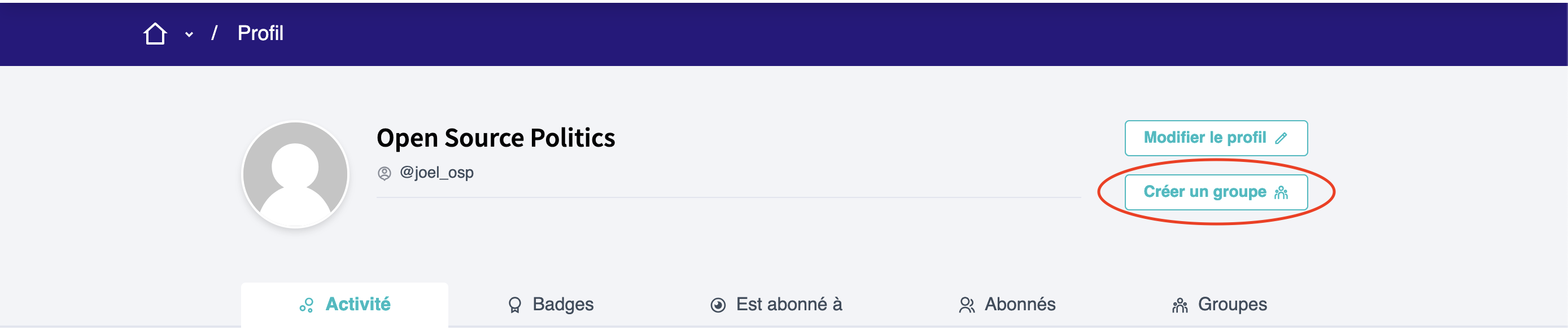 Sur ce profil utilisateur, cliquez en bas à gauche de la page sur "Créer un groupe".