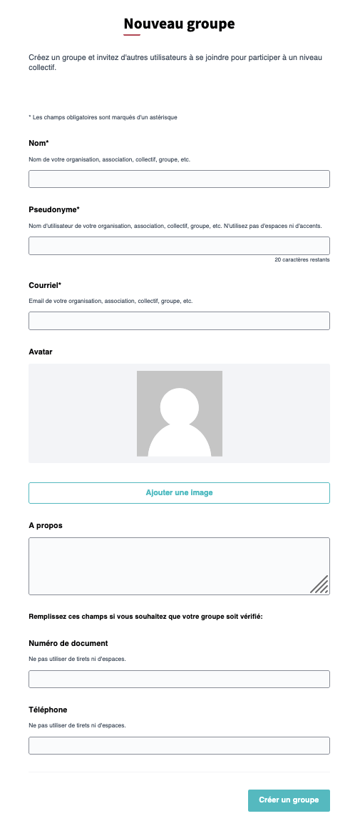 - Nom : nom du groupe d'utilisateurs (association, institution ou groupe informel pour contribuer sur la plateforme)