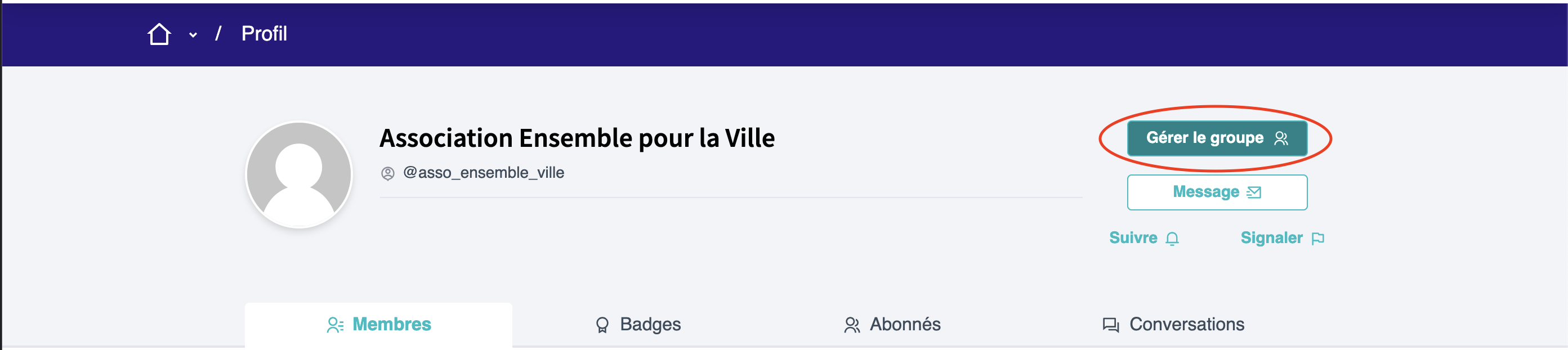 Après avoir rempli ces champs, cliquez sur "Créer un groupe". La fenêtre nouvellement ouverte vous permettra de suivre et de gérer le groupe d'utilisateurs nouvellement créé : ses membres, les utilisateur·ices qui y sont abonné·es et les badges obtenus pas le groupe. Un menu à gauche de la fenêtre vous permet de réaliser plusieurs actions :