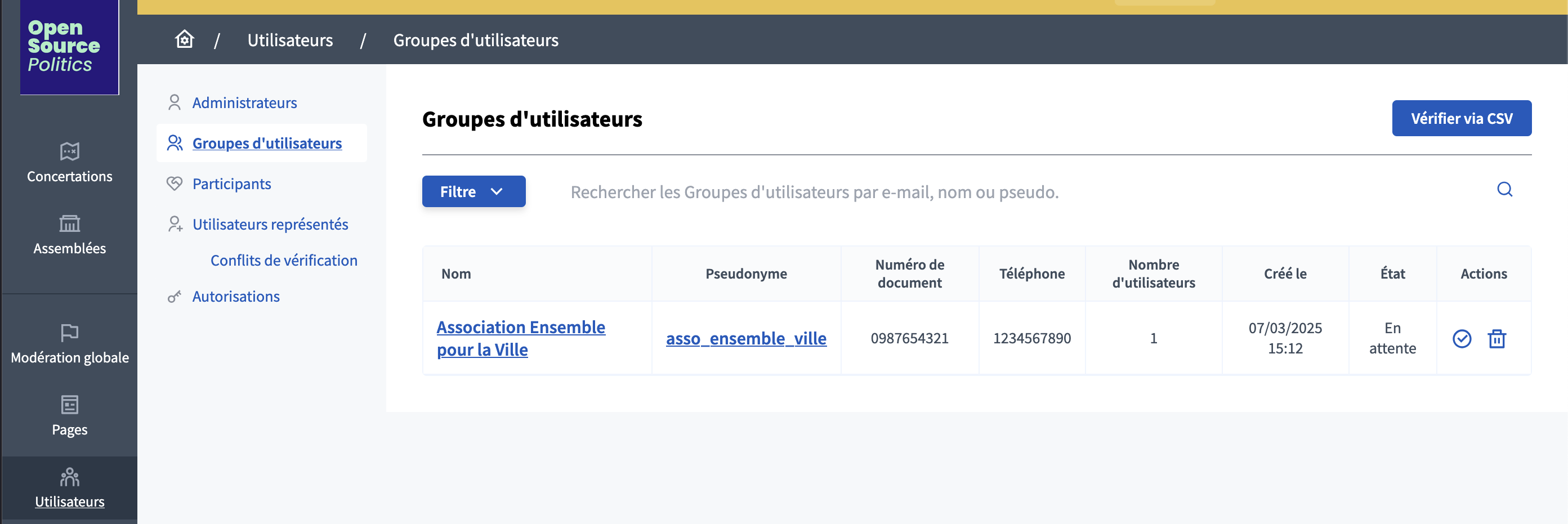 - Actions : c’est ici que vous pouvez vérifier ✅ ou bien rejeter 🗑️ le groupe d’utilisateurs.
