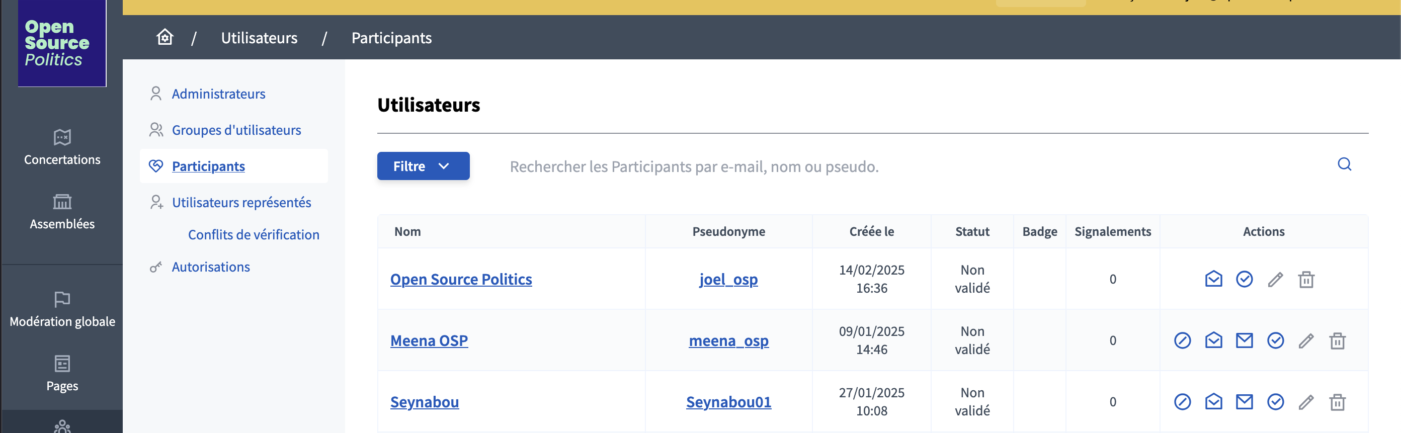 Dans le sous-menu “Participants”, une liste d’utilisateur·ices apparaît. Les nom, pseudonyme, date et heure de création, statut de vérification, badge et nombre de signalements sont indiqués. Sur cet index des participant·es, vous pouvez les rechercher ainsi que les filtrer. Quatre actions sont disponibles : bloquer une personne 🚫, montrer son adresse mail 📨, la contacter ✉️ et la vérifier ✅.