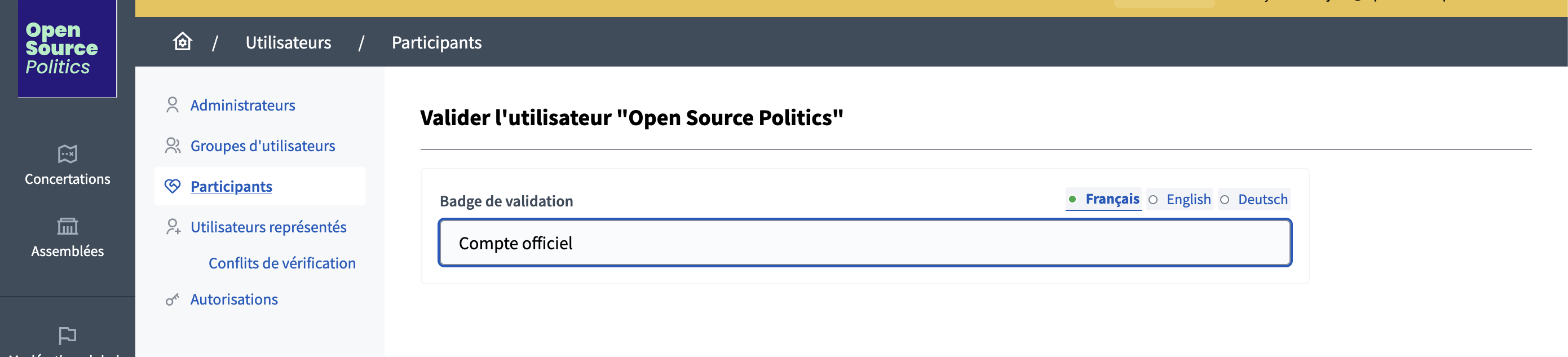 Ce même badge s'affichera à côté de son pseudo lorsqu'elle déposera une proposition, une pétition ou un commentaire au sein d'une fonctionnalité participative.