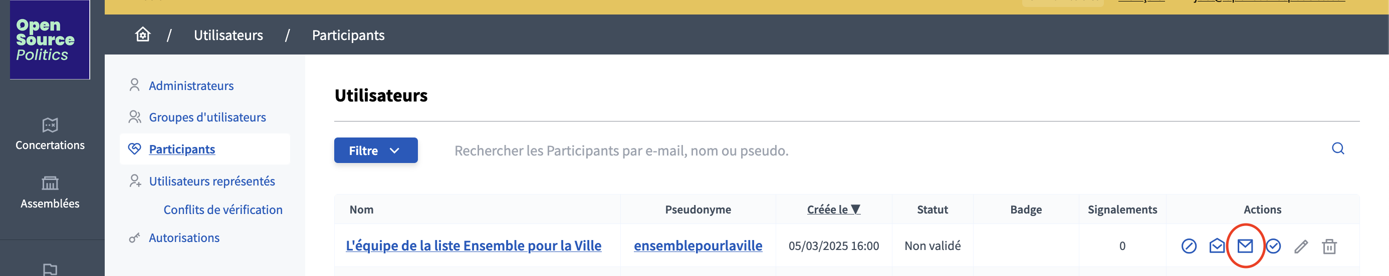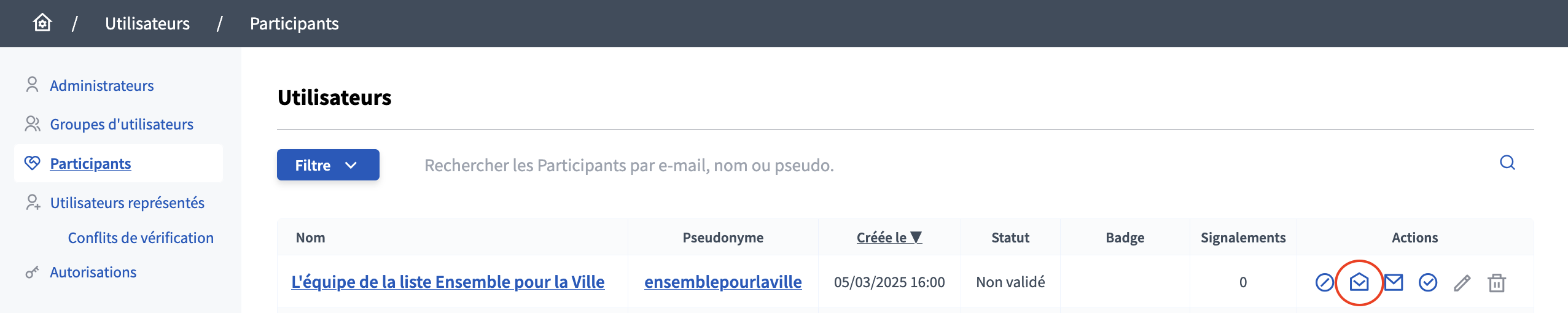 Le back-office vous fait apparaître à de nombreuses reprises la possibilité de contacter directement une personne inscrite via la messagerie interne de la plateforme. Vous pourrez notamment trouver l'icône "Enveloppe" à côté du nom sur :