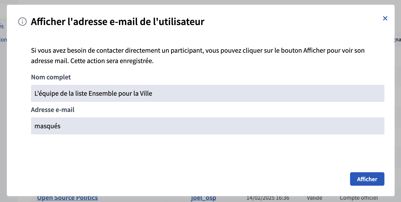 Vous verrez alors apparaître la modale suivante. Pour faire apparaître l'adresse mail de quelqu'un, cliquez sur le bouton "Afficher".