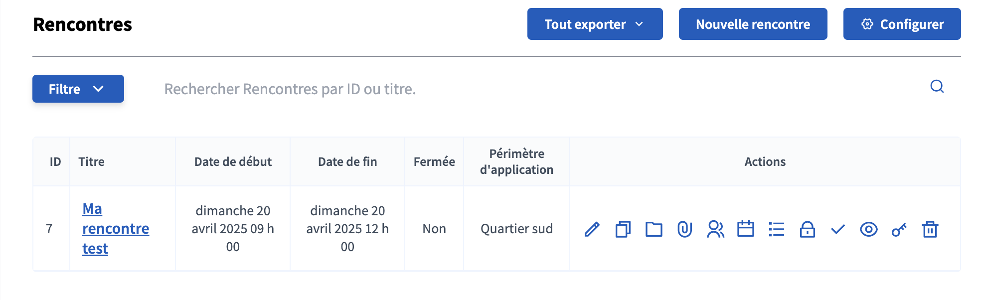 Une fois que le module Rencontres a Ă©tĂ© configurĂ©, vous pouvez crĂ©er des rencontres. Pour cela, cliquez sur l'onglet âRencontresâ dans le sous-menu Ă gauche.