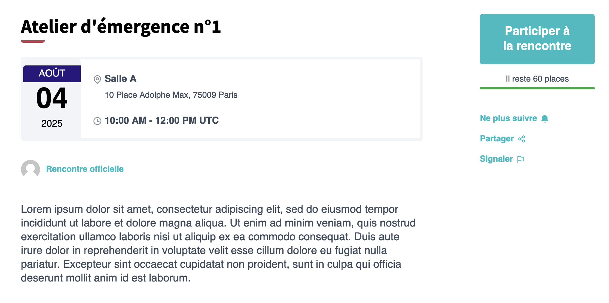 La rencontre ci-dessous est une rencontre hybride, avec lien de la rencontre intégré à la page de la rencontre, avec 60 places disponibles et inscriptions sur le plateforme. Les commentaires sont désactivés. Un exemple de formulaire d'inscription est consultable ci-dessous.