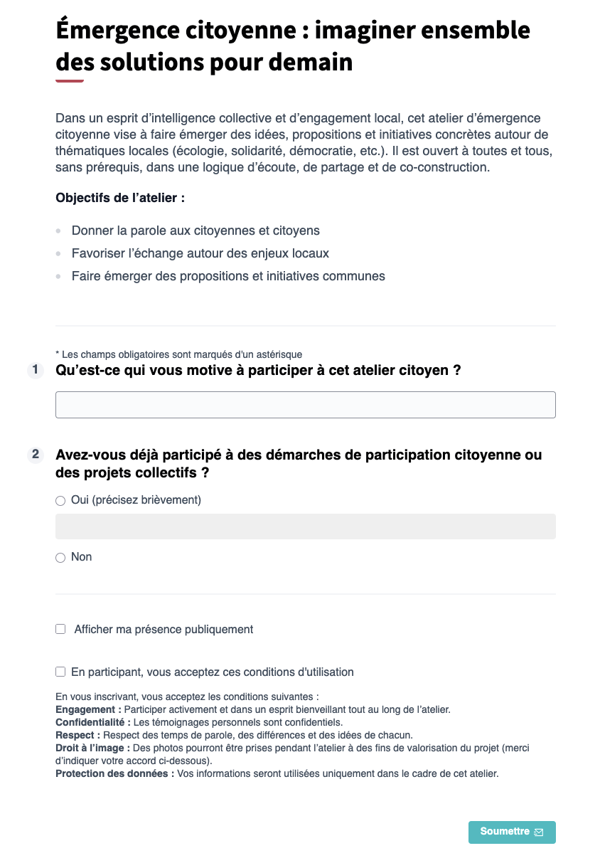 Sur cette plateforme : Les utilisateur·ices pourront cliquer sur un bouton pour s'inscrire. Indiquez le nombre de places disponibles pour cette rencontre, et lorsque ce nombre aura Ă©tĂ© atteint, le bouton sera dĂ©sactivĂ© pour les nouvelles personnes tentant de s'inscrire.Si vous activez cette option, rappelez-vous d'aller Ă©galement activer les inscriptions en cliquant sur le bouton "đ„ : GĂ©rer les inscriptions".