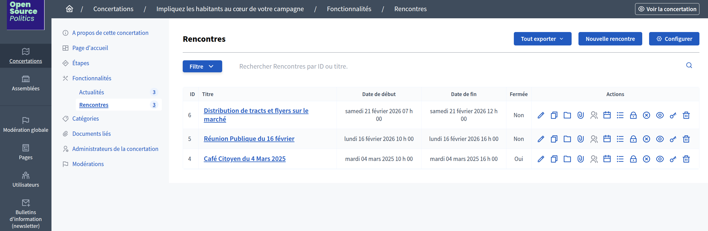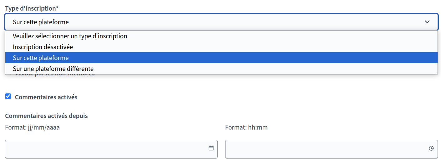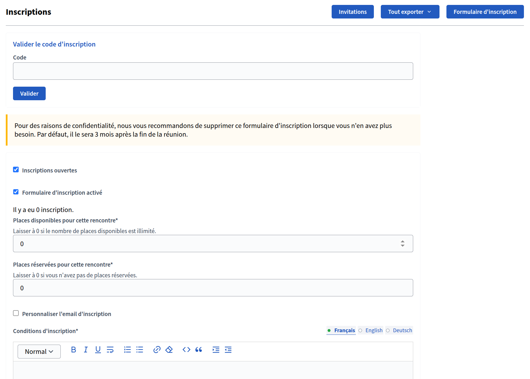 Pour activer les inscriptions, cliquez sur la rencontre et descendez dans les paramètres afin d'activer les inscriptions sur la plateforme