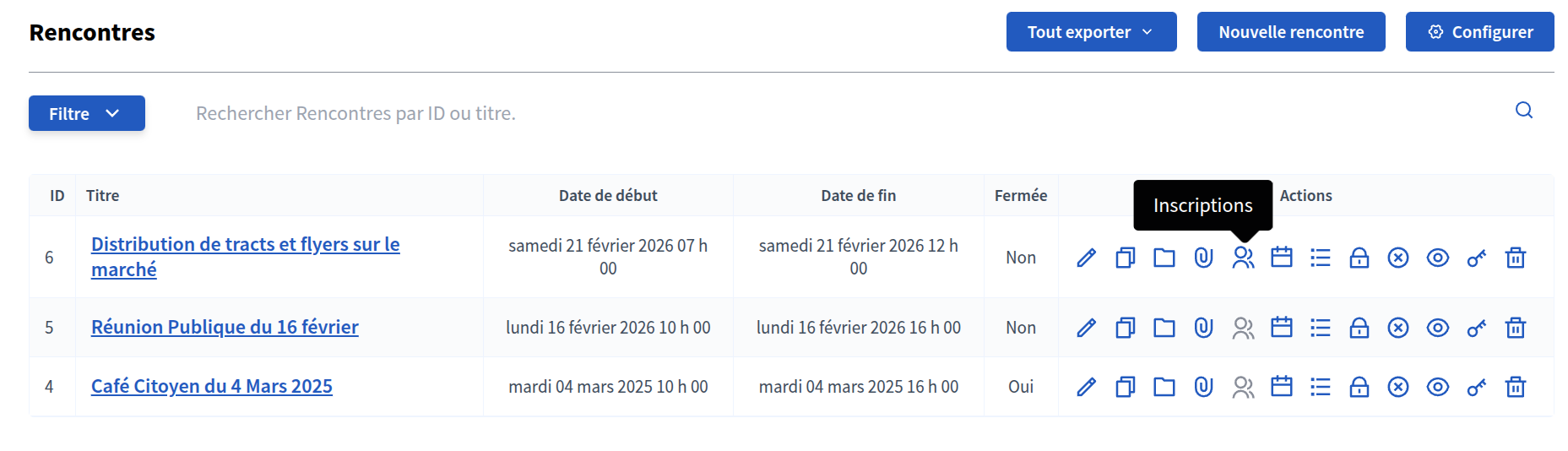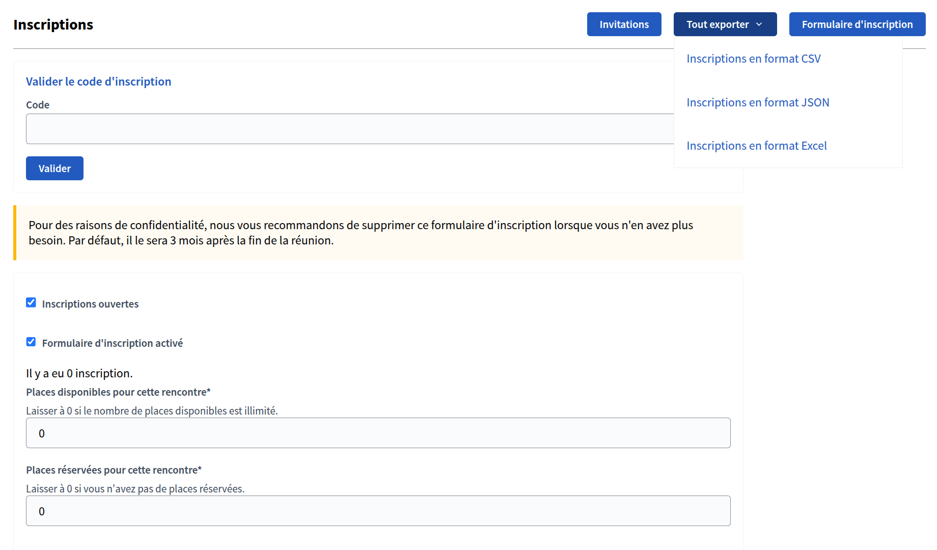 Vous pouvez également exporter une liste des inscrit·es aux formats CSV, JSON ou EXCEL en cliquant sur "Tout exporter" .