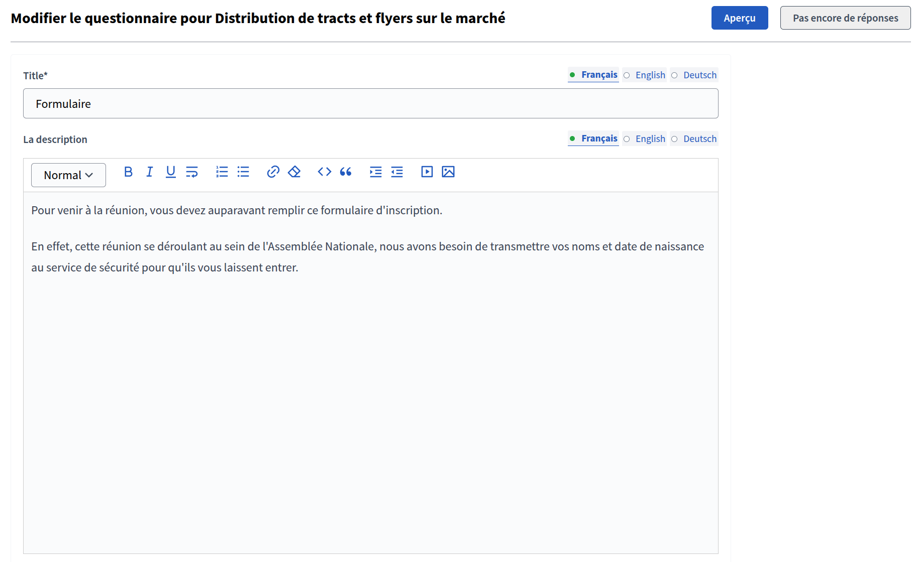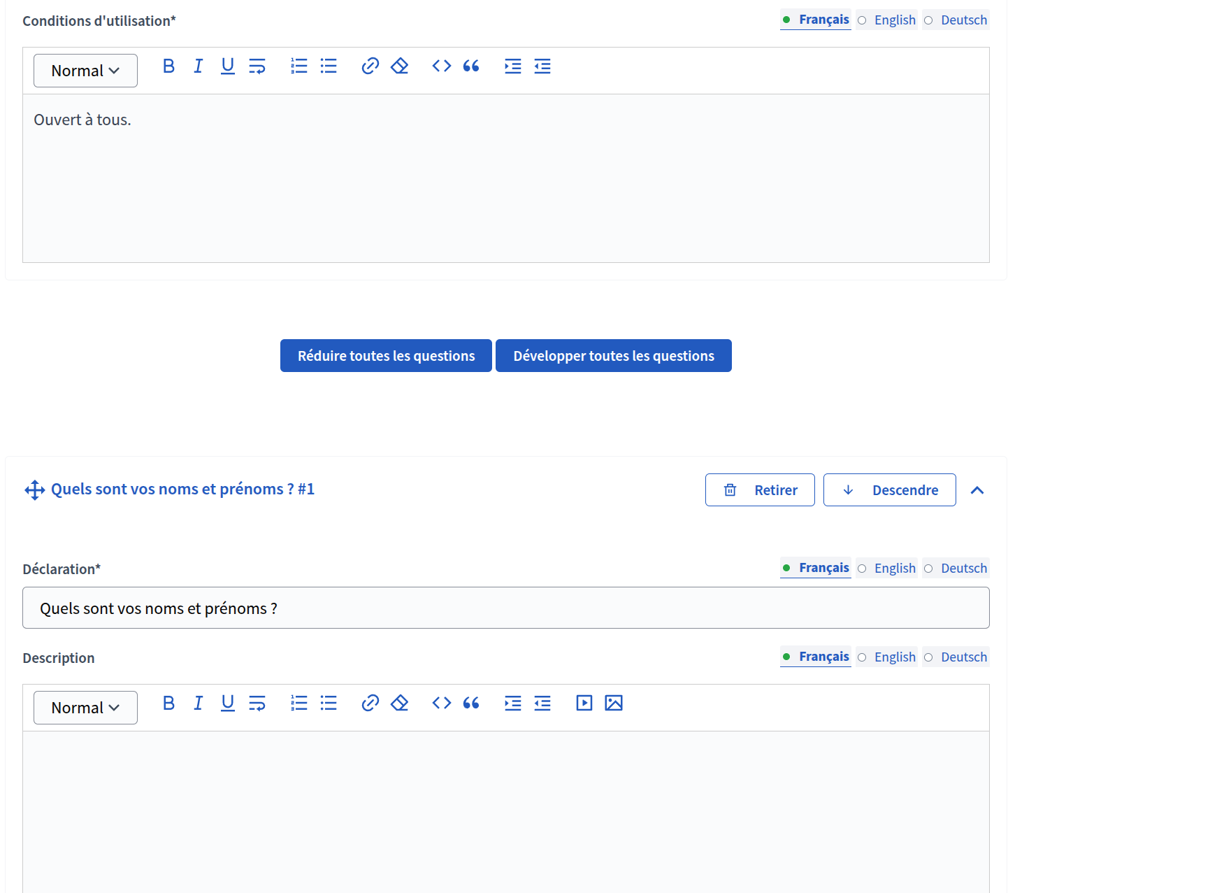 Entrez le Titre, la description et les conditions d'utilisation du formulaire. A la manière d'une enquête, vous pouvez ajouter des questions de type "Réponse courte", "Longue réponse", "Option unique", "Option multiple" et "Tri".