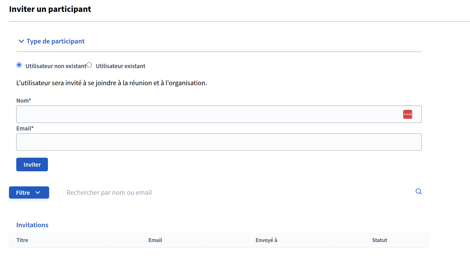 Sélectionnez le Type de participant dont il s'agit. Si l'utilisateur·ice n'est pas existant, il vous suffit alors d'entrer le nom et l'e-mail de la personne que vous souhaitez inviter à la rencontre. Si l'utilisateur·ice est déjà inscrit·e sur la plateforme, entrez simplement son nom sur la barre de recherche, et sélectionnez le lorsque son nom apparaît.