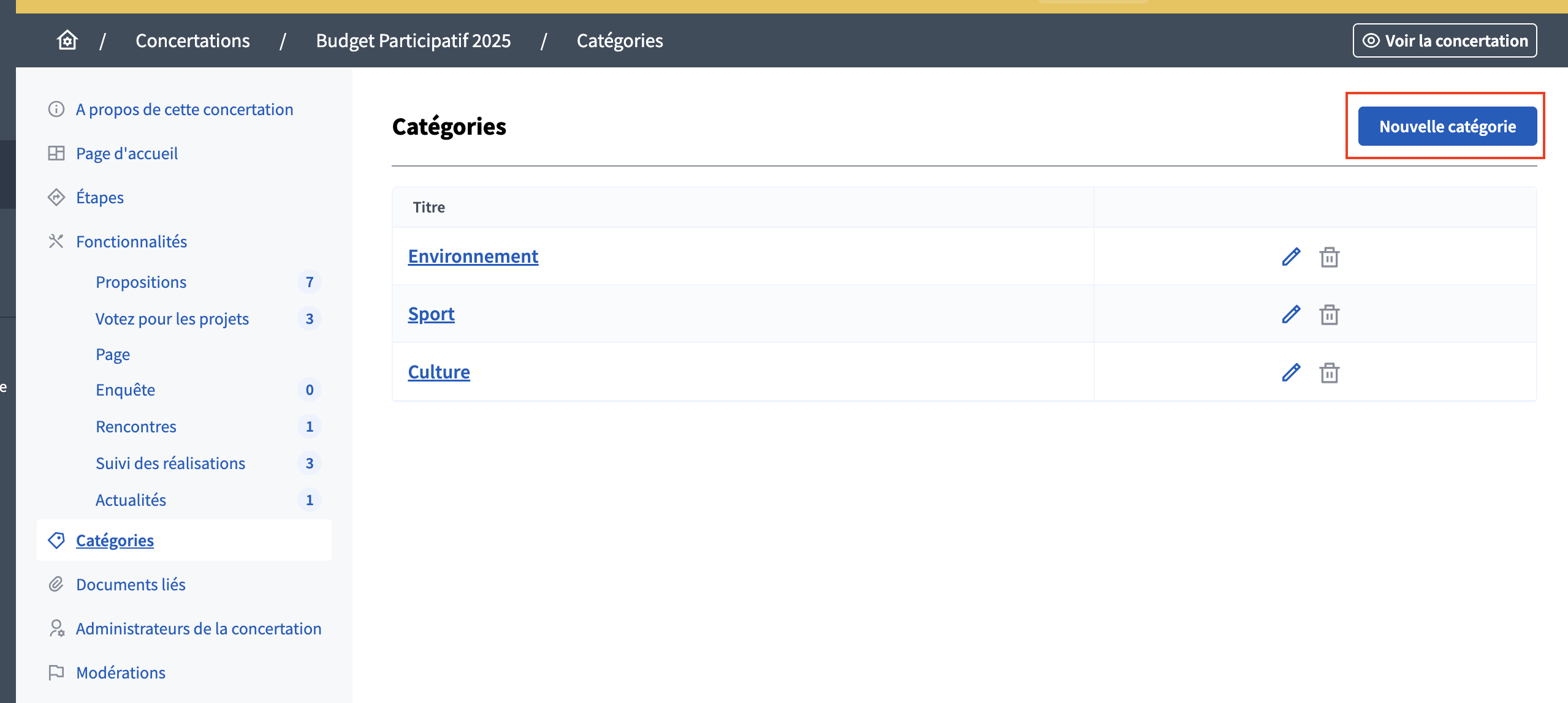 Les catégories servent à thématiser les propositions, les résultats et les rencontres qui sont créées pour l'espace participatif. Elles facilitent le filtrage et la recherche des contenus. Lors de la création d'une proposition officielle, d'une réalisation ou d'une rencontre, vous pouvez attribuer à celle-ci l’une des catégories que vous aurez définies au préalable.