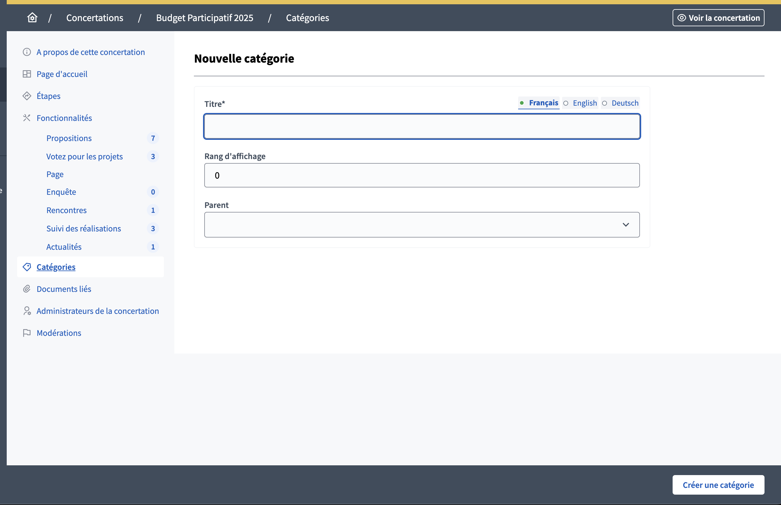 Vous pouvez accéder aux catégories dans les sous-menu d'une assemblée ou d'une concertation, à l'onglet "Catégories". Pour créer une nouvelle catégorie, cliquez sur “Nouvelle catégorie” et remplissez le formulaire ci-dessous :