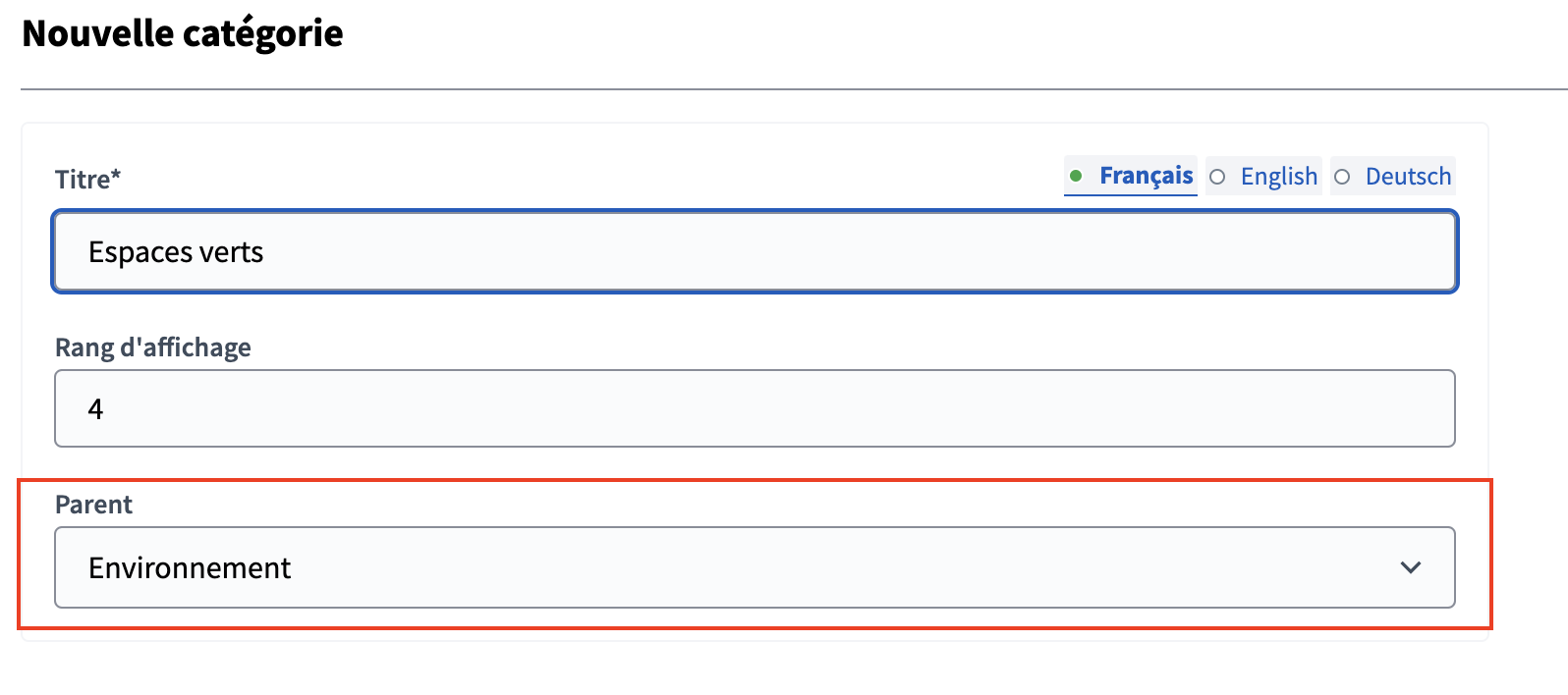 Notez qu’il est possible de choisir un parent pour la catégorie que vous créez. Dans ce cas, elle sera enregistrée comme sous-catégorie, permettant ainsi une organisation hiérarchique des thèmes.
