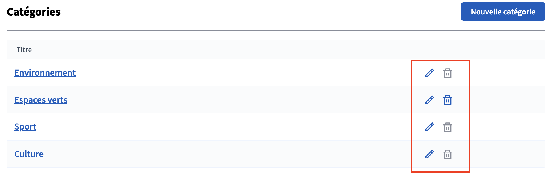 Vous pouvez éditer chaque catégorie en cliquant sur l'icône "Modifier", ou bien la supprimer en cliquant sur l'icône "Supprimer".