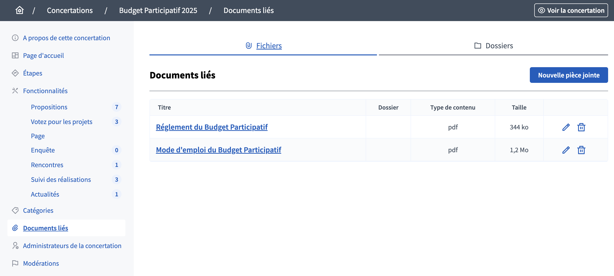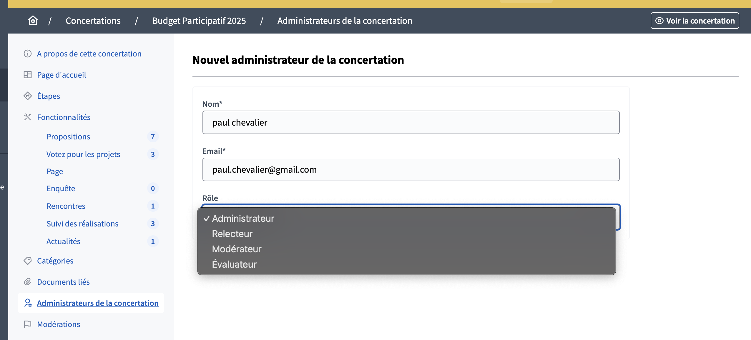 Que vous soyez en train de paramétrer une concertation ou une assemblée, vous pouvez permettre à un ou plusieurs utilisateur·ices de contribuer à la configuration et au suivi de votre votre espace participatif. Ces personnes n'auront accès qu'aux espaces dans lesquels vous les aurez invitées. Elles ne pourront pas modifier les paramétrages de la plateforme dans son ensemble, ou ajouter de nouveaux espaces participatifs. Ci-dessous, vous pouvez voir le tableau de bord administrateur du point de vue d'un administrateur·ice d'une concertation :