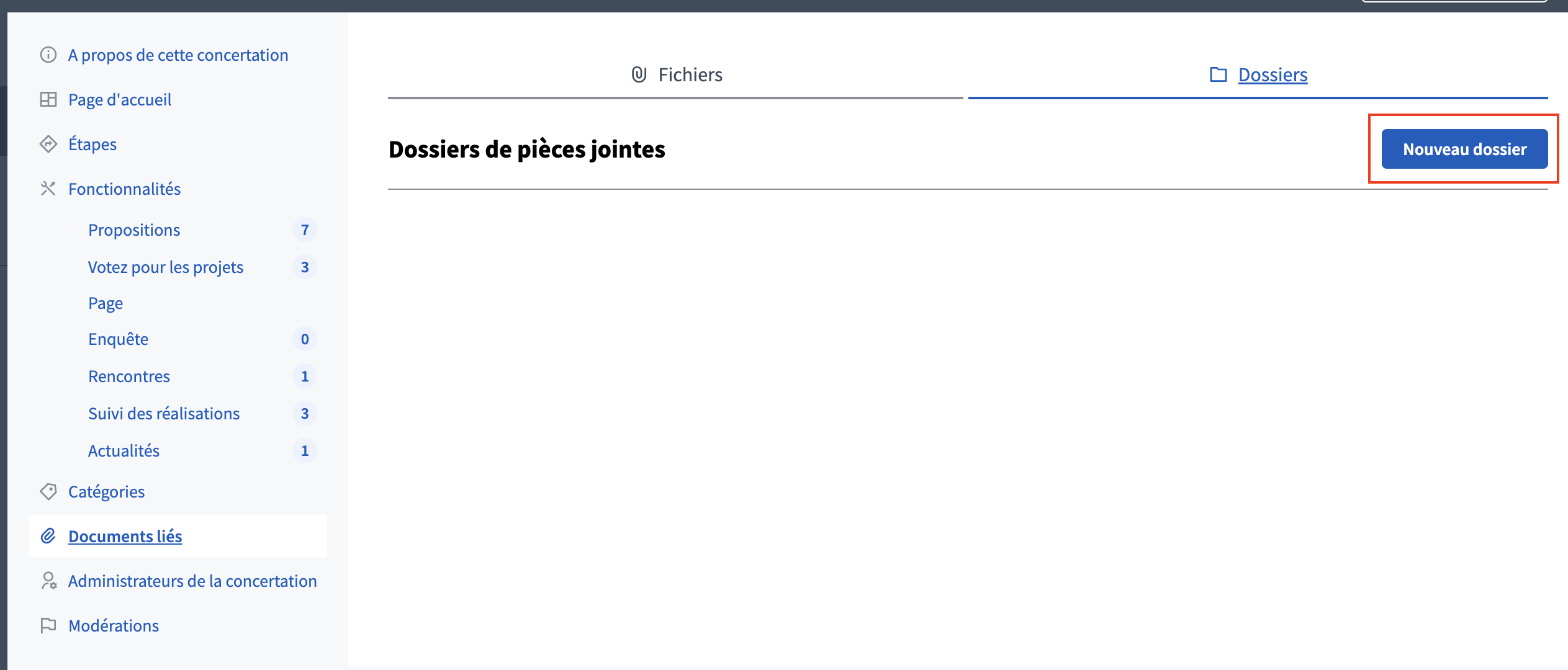 Il est possible, dans le cas de l’ajout de plusieurs documents liés à la concertation, de créer des dossiers pour trier les documents. Pour créer un Dossier, rendez-vous dans l'onglet "Dossiers" du sous-menu de votre espace participatif, et cliquez sur "Nouveau dossier".