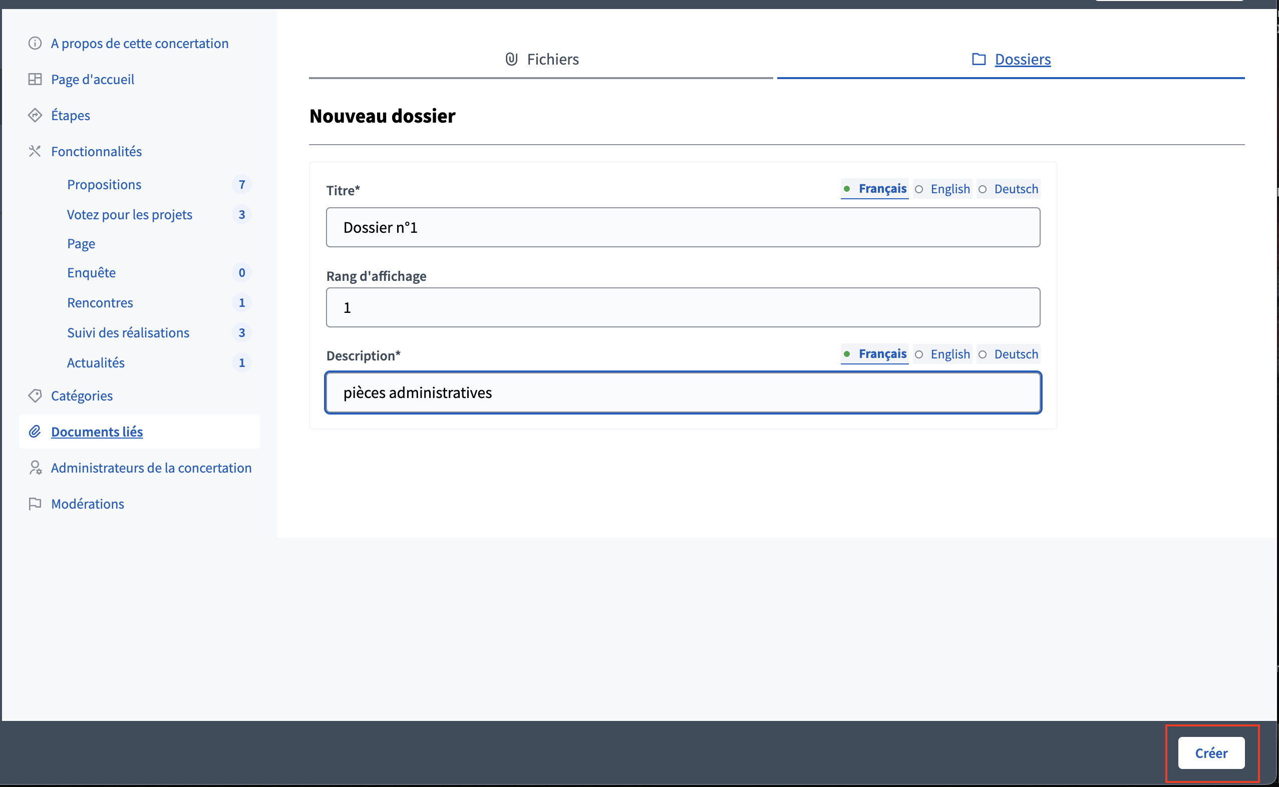 Un dossier dispose d'un titre, un rang d’affichage et une description.