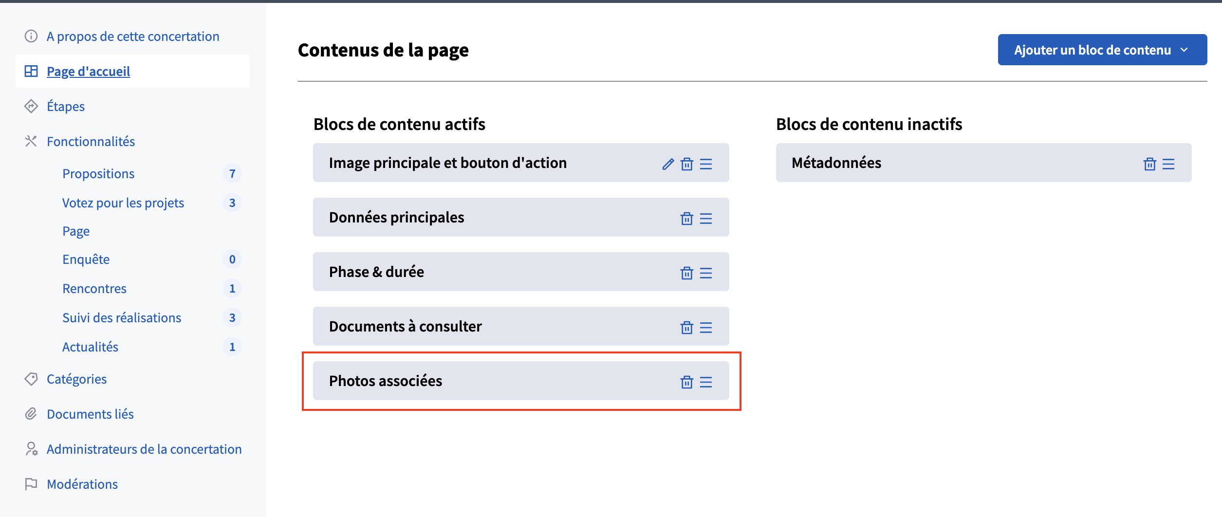 Les images s’afficheront sous la catégorie “Photos associées" uniquement si ce bloc à été activé dans les paramètres de page d'accueil de la concertation. Sont acceptés les formats .jpeg, .jpg, .png.