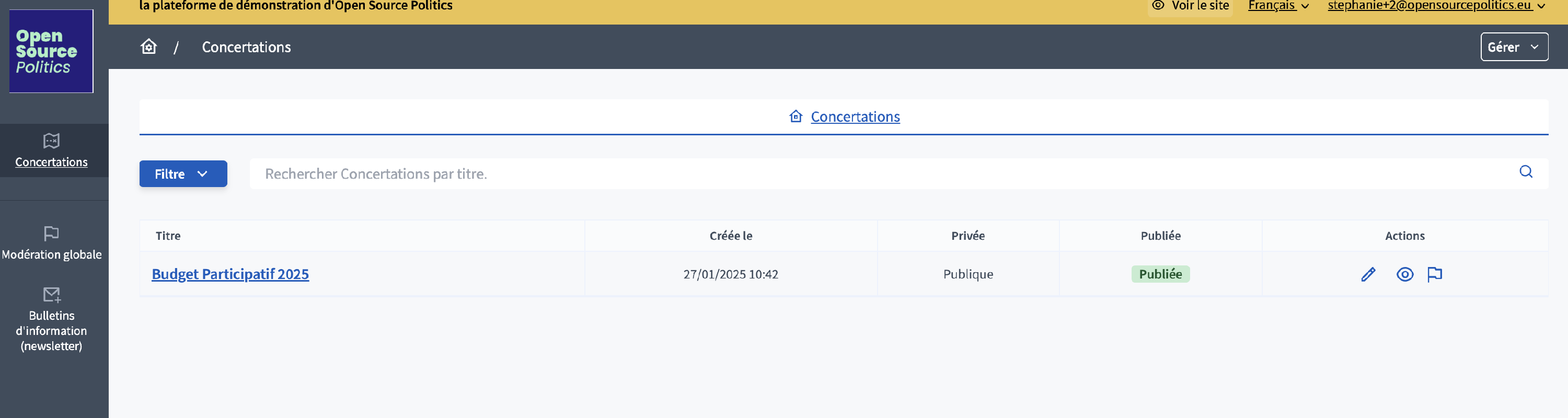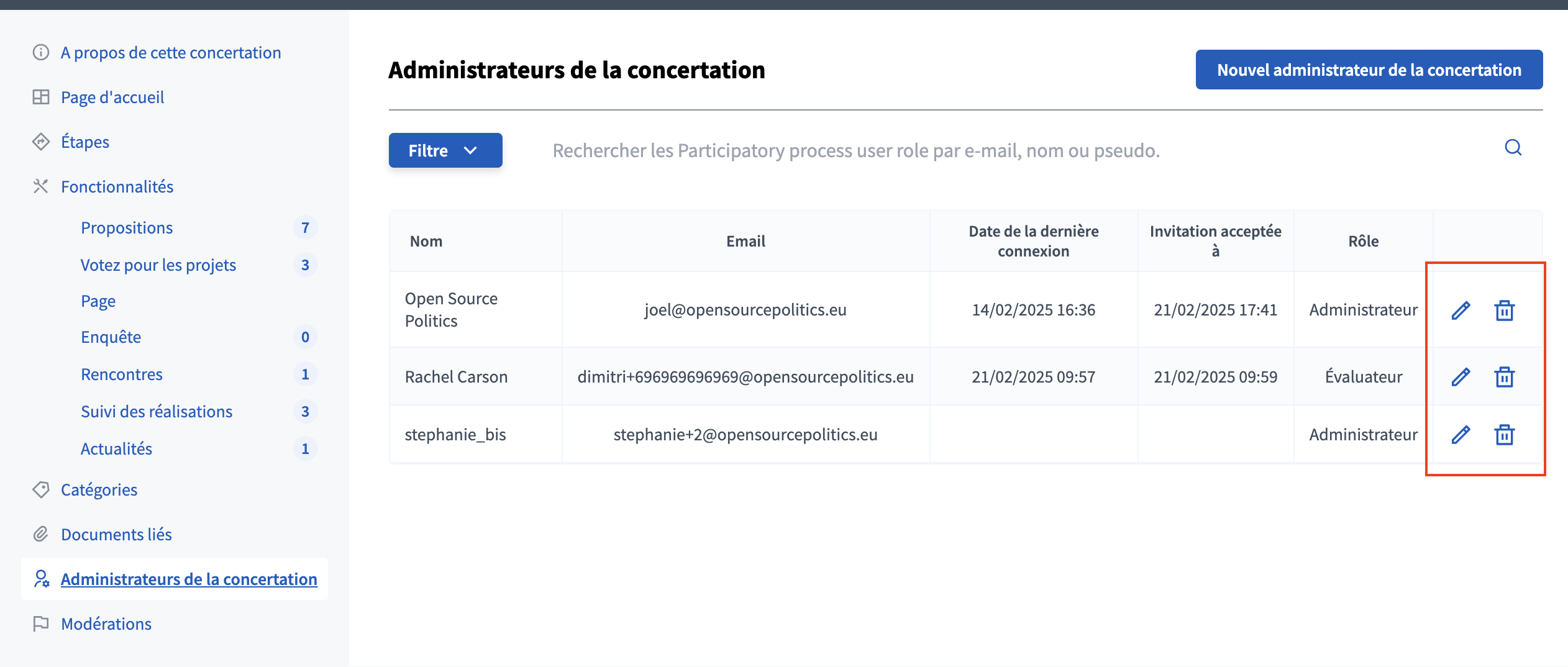 En cliquant sur Créer, Decidim envoie automatiquement une invitation à la personne ajoutée. Vous pouvez suivre les différentes personnes ajoutées dans les Administrateurs de la concertation. Trois actions s'offrent à vous :