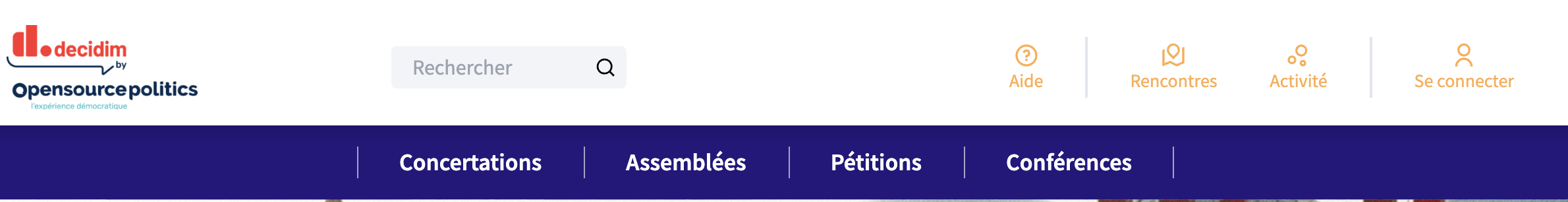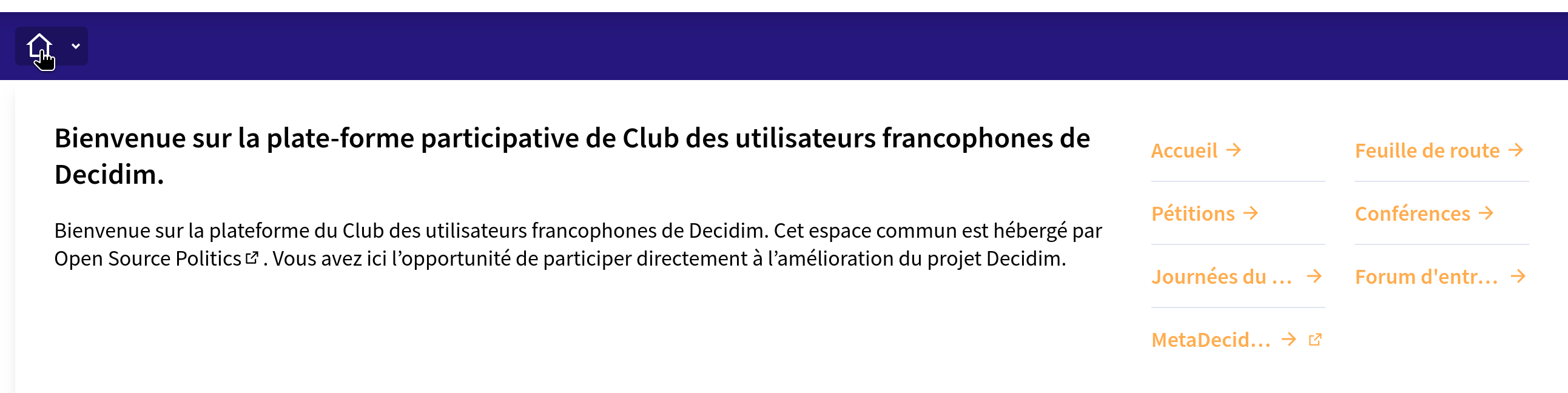 Cette section permet d’intervenir sur les onglets du menu de navigation de page d'accueil de Decidim en y masquant, modifiant ou ajoutant des éléments ; elle permet aussi de changer l'ordre des rubriques, d’ajouter certaines conditions (comme l'affichage d’une rubrique uniquement pour les utilisateur·ices connecté·es) ou encore d’ouvrir la rubrique dans une nouvelle fenêtre.