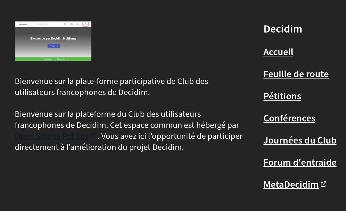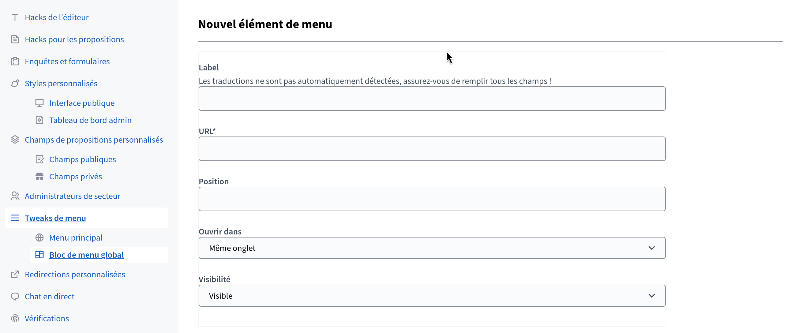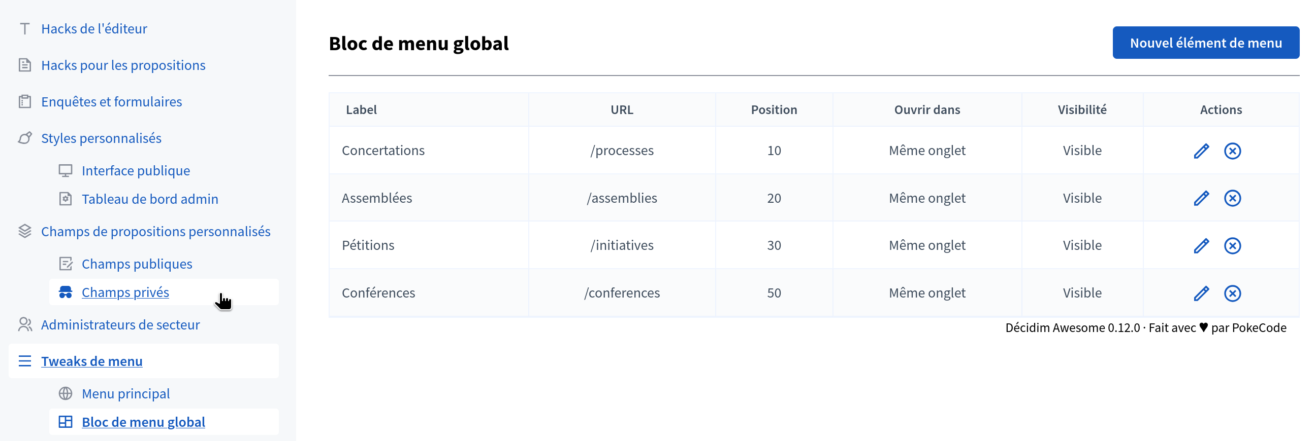 Arès avoir cliqué sur Decidim Awesome dans la barre de navigation latérale, vous avez accès aux "Tweaks de menu"