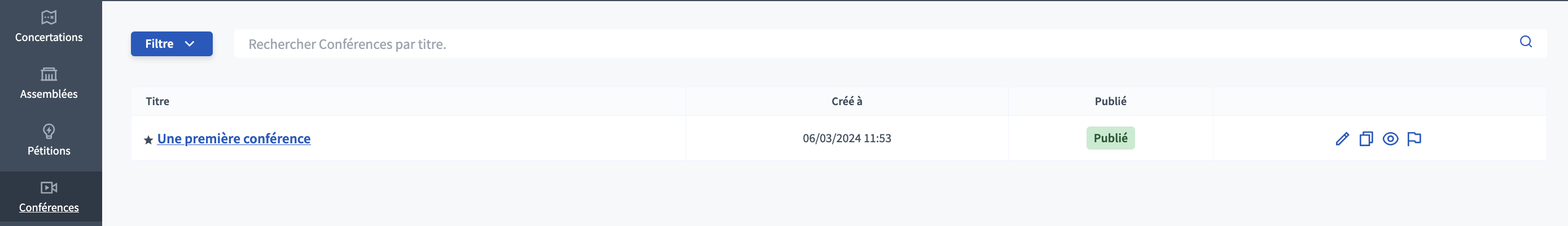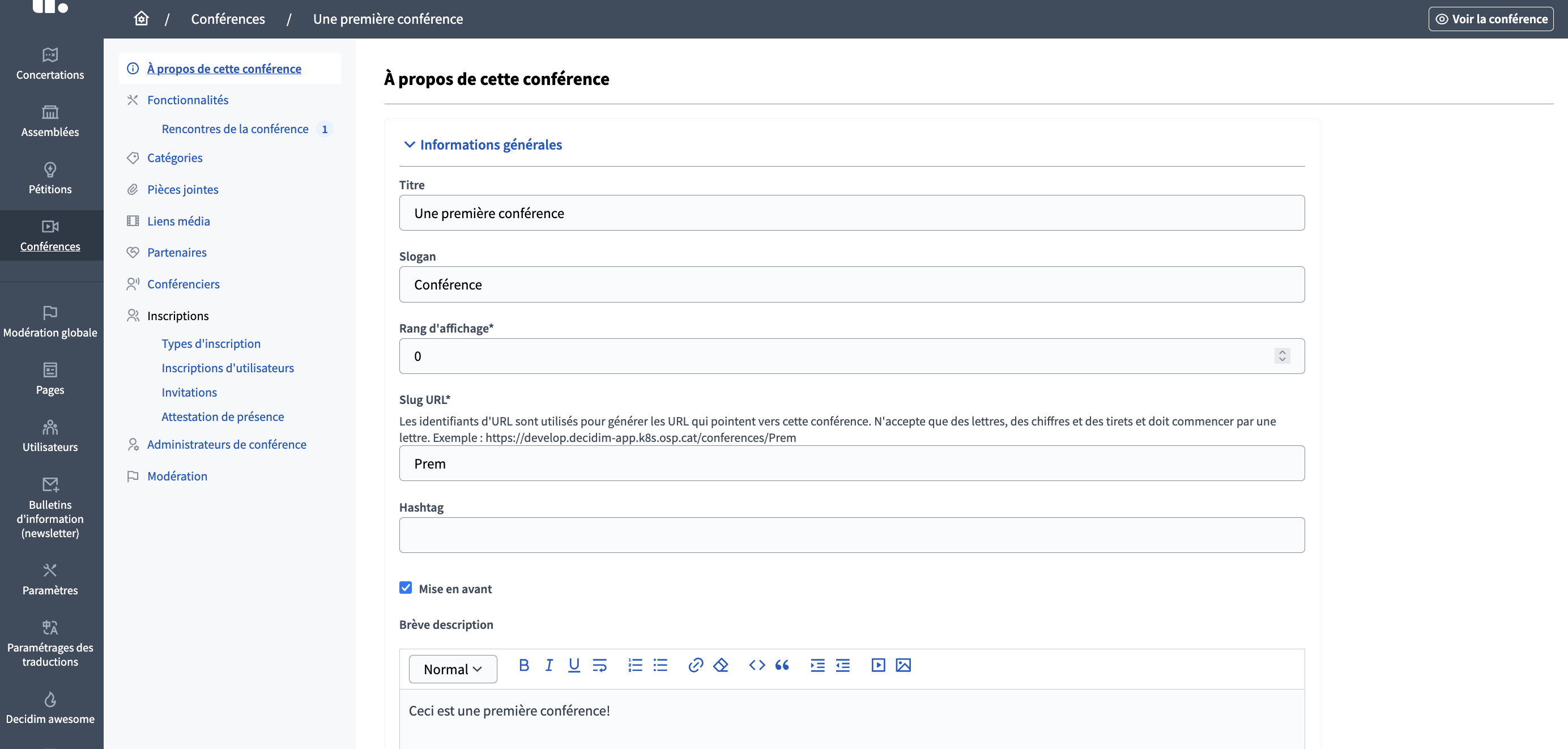 Une fois que vous aurez configuré votre Conférence et ses fonctionnalités, n’oubliez pas de la Publier. Nous vous exposons ici uniquement les éléments qui diffèrent des Concertations. Nous n’évoquerons donc pas la configuration des Catégories, l’ajout de pièces jointes et de dossiers ou encore la modération des contributions. Pour plus d’informations sur les fonctionnalités disponibles sur Decidim, veuillez vous référer à la section "Les fonctionnalités participatives" de cette documentation.