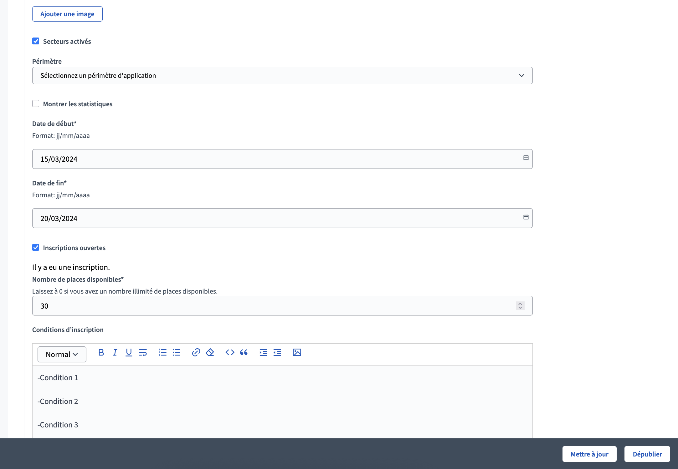 - Activer les inscriptions : si vous souhaitez que les utilisateur·ices puissent s’inscrire directement via Decidim