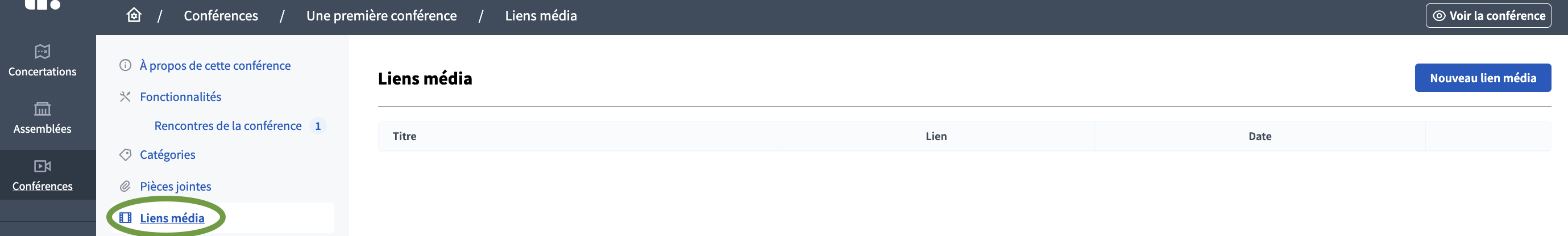 Pour ajouter des liens externes sur votre Conférence, cliquez sur “Liens médias”. Ces liens seront ensuite disponibles dans le menu “Médias” de votre Conférence. Vous pouvez également y retrouver les pièces jointes et dossiers que vous paramétrez (voir ci-dessous).