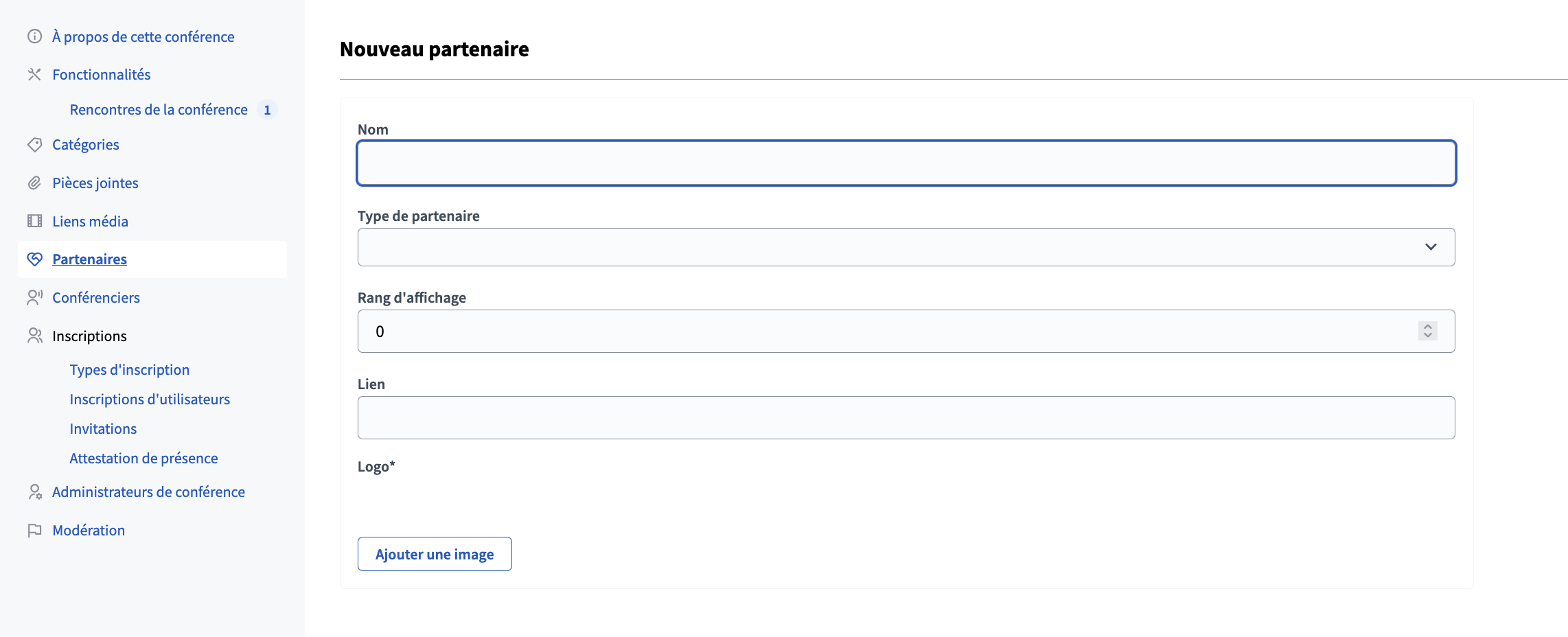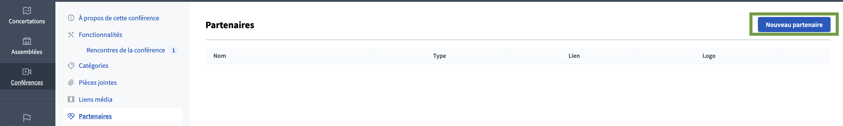 Pour renseigner les partenaires de votre Conférence, rendez-vous dans l’onglet “Partenaires” du sous-menu.