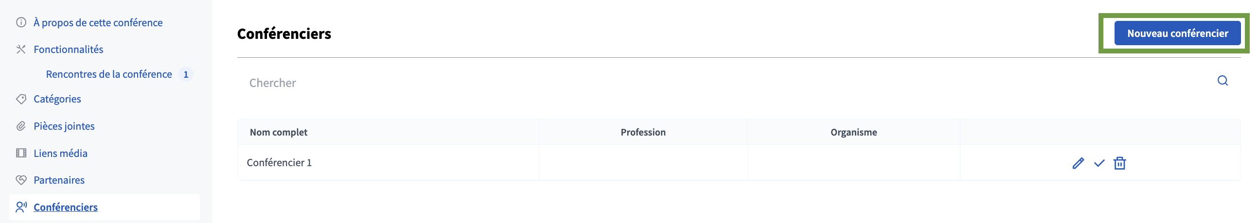 Pour renseigner les intervenant·es de votre Conférence, rendez-vous dans l’onglet “Conférenciers” du sous-menu, puis cliquez sur “Nouveau Conférencier”.