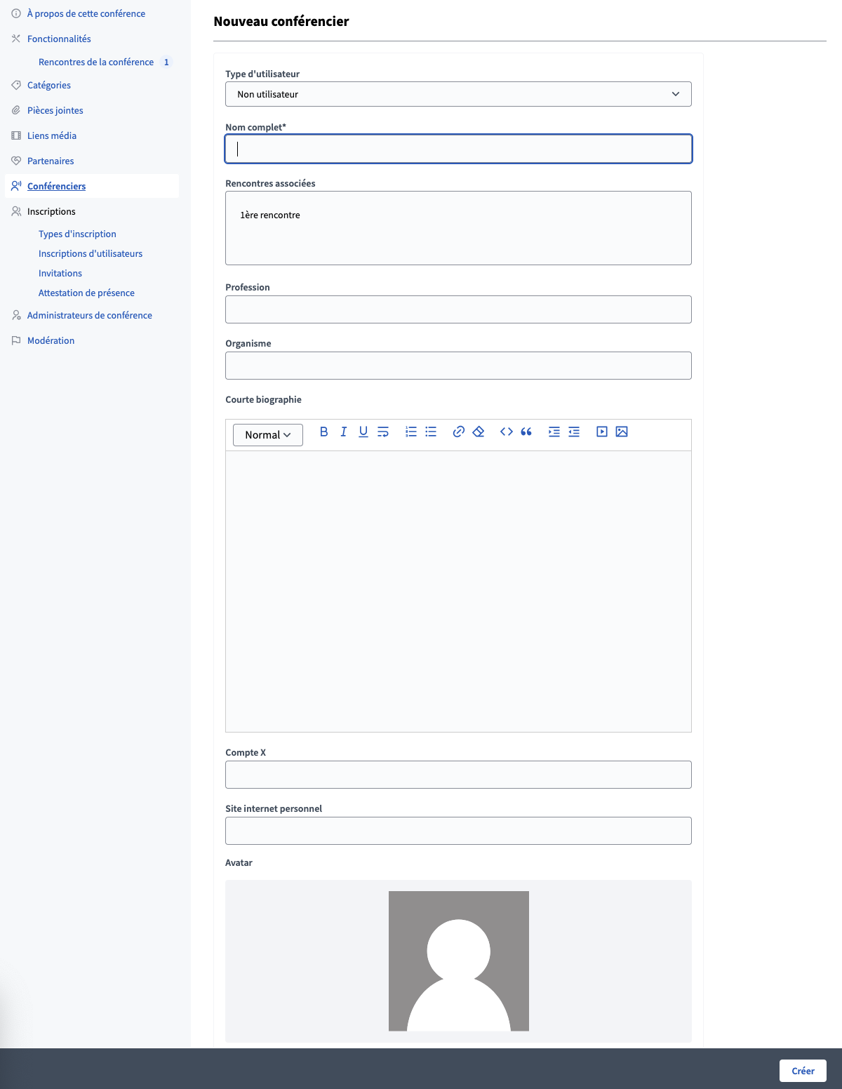 Vous pouvez ensuite lier cet·te intervenant·e aux différentes rencontres (ateliers, tables-rondes) de la Conférence au sein desquelles il·elle intervient. Indiquez ensuite sa Profession ainsi que l’organisme (entreprise, association, administration) auquel il est rattaché.